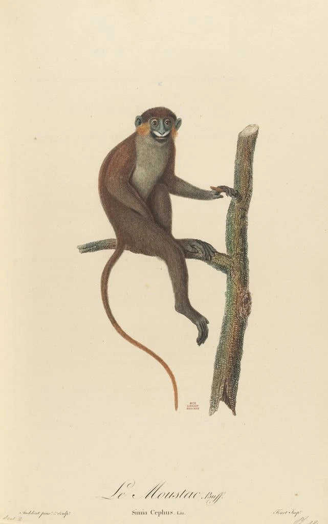 In diesem faszinierenden Werk präsentiert Jean-Baptiste Audebert den Moustac, ein emblematisches Tier Madagaskars. Das Gemälde zeichnet sich durch leuchtende Farben und eine sorgfältige Technik aus, die die Textur des Fells und den lebhaften Ausdruck des Tieres offenbart. Die Atmosphäre, die von diesem Werk ausgeht, ist sowohl dynamisch als auch fesselnd und taucht den Betrachter in die reiche Welt der madagassischen Fauna ein. Audebert gelingt es durch sein Talent, diesen Moment des Lebens zu verewigen und ein Fenster zu einer oft unbekannten Tierwelt zu öffnen.
