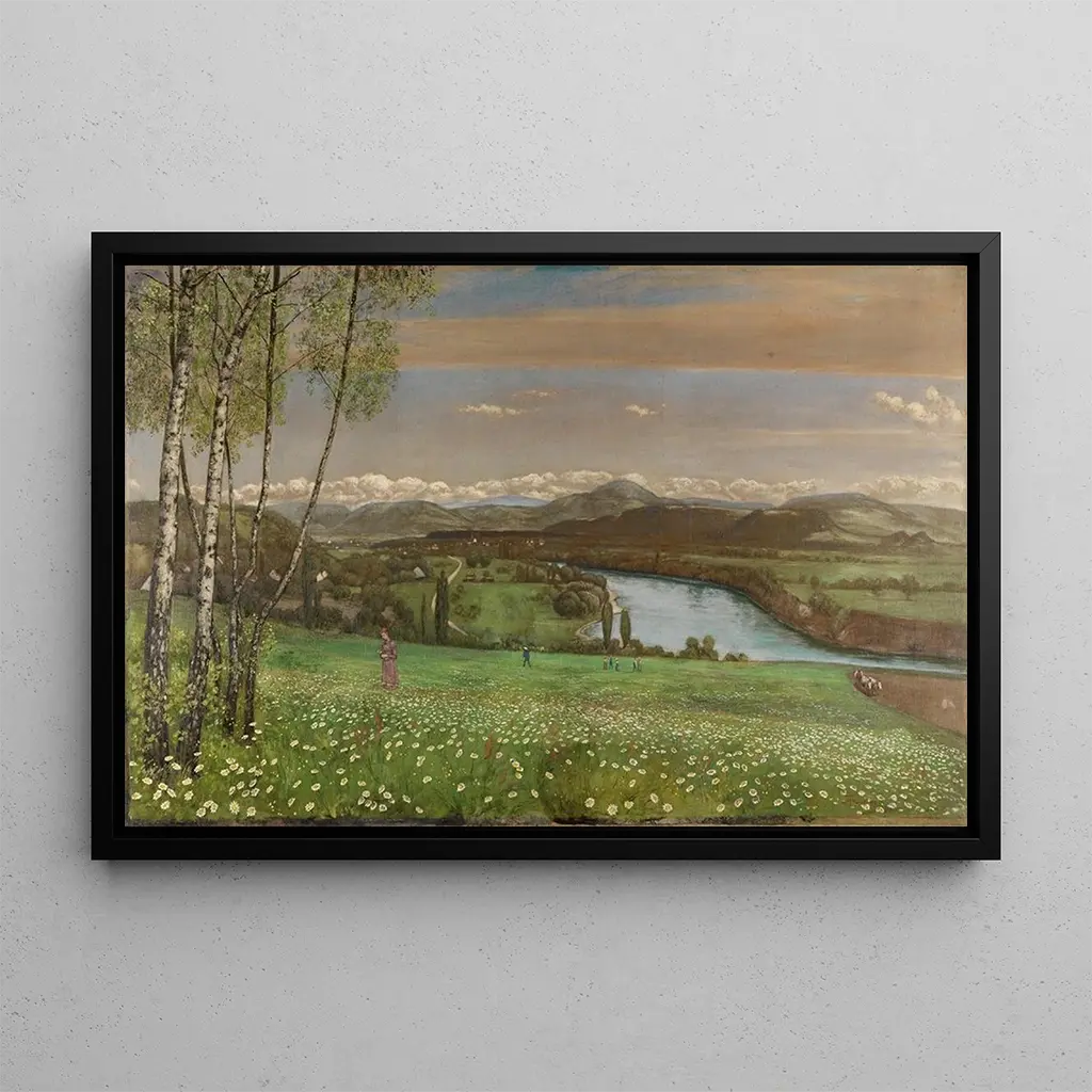 La Vallée du Rhin près de Säckingen, ein bedeutendes Werk von Hans Thoma, vermittelt eine friedliche und idyllische Atmosphäre. Die Nuancen von Grün und Blau verschmelzen harmonisch und schaffen eine Landschaft, in der die Natur erblüht. Die Technik des Ölgemäldes ermöglicht es, das Licht auf zarte Weise einzufangen, während die detaillierten Darstellungen der Bäume und Hügel zu längerer Betrachtung einladen. Dieses Gemälde, mit seinem klaren Himmel und den Wasserreflexionen, versetzt den Betrachter in einen Moment der Ruhe, fernab vom Trubel des modernen Lebens.