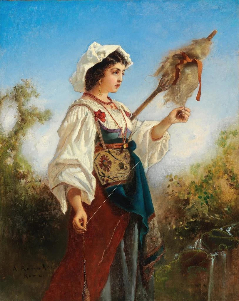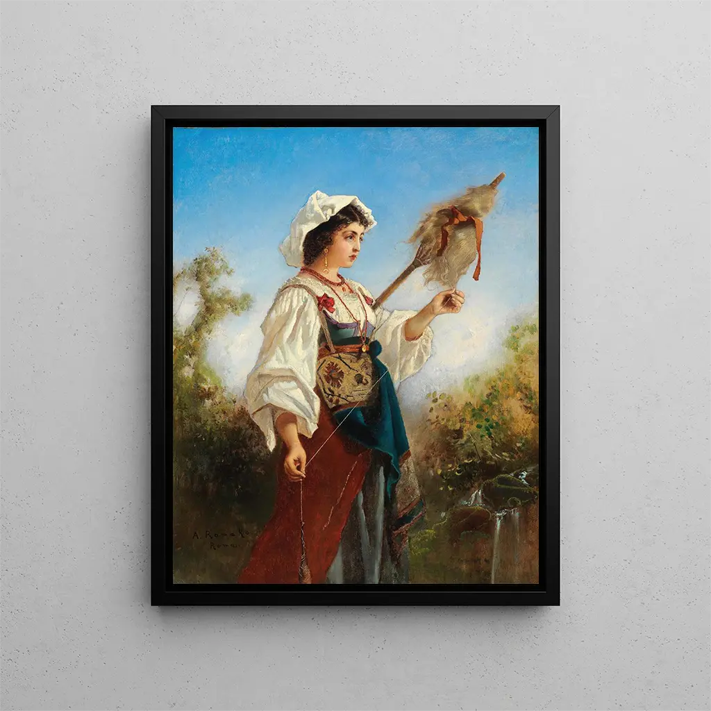Reproduktion Datei Roma Spinnerin - Anton Romako – Fesselnde Einführung Im weiten Panorama der Kunstgeschichte hallen bestimmte Werke mit besonderer Intensität wider, fangen nicht nur die Fantasie der Betrachter ein, sondern auch das Wesen einer Epoche. "Datei Roma Spinnerin" von Anton Romako ist eines dieser Werke, das den einfachen Rahmen eines Gemäldes übersteigt und zu einer Eintauchen in die Welt des antiken Roms wird. Durch dieses Werk versetzt uns der Künstler in einen schwebe Moment, in dem die Zeit stillzustehen scheint, um Raum für Kontemplation zu schaffen. Die Szene zeigt eine Spinnerin bei der Arbeit, Symbol des Alltagslebens und der weiblichen Arbeit, während sie gleichzeitig eine zeitlose Schönheit evoziert. Dieses Gemälde lädt durch seine Realismus und Tiefe zu einer Reflexion über die Rolle der Frauen in der antiken Gesellschaft ein und feiert zugleich die Kunst des Spinnens, ein wesentliches Handwerk der damaligen Zeit.