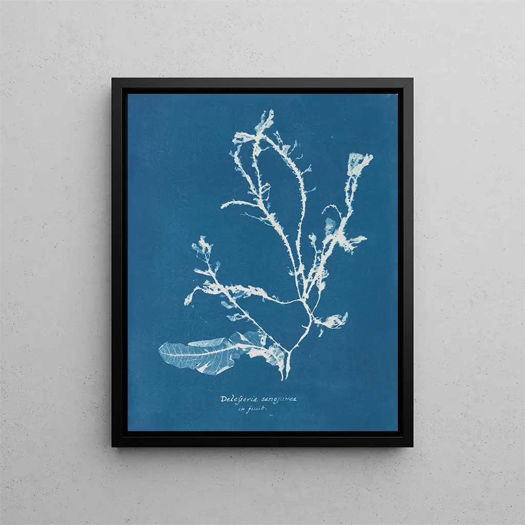 Reproduktion Delesseria sanguinea en fruit - Anna Atkins – Einführung fesselnd In der zarten und faszinierenden Welt der botanischen Kunst hebt sich das Werk "Delesseria sanguinea en fruit" von Anna Atkins durch seine beeindruckende Schönheit und seinen innovativen Ansatz hervor. Dieses Werk, das im 19. Jahrhundert geschaffen wurde, ist viel mehr als nur eine einfache Studie der Natur; es stellt eine harmonische Verbindung zwischen Wissenschaft und Ästhetik dar. Atkins, Pionierin der Fotografie und botanischen Illustration, hat es verstanden, das Wesen der Natur durch eine Technik einzufangen, die ihr eigen ist. Beim Erkunden der Feinheiten der Algen lädt sie uns ein, in eine Welt einzutauchen, in der jedes Detail eine Geschichte erzählt und jede Farbnuance eine Emotion hervorruft. Stil und Einzigartigkeit des Werks Was "Delesseria sanguinea en fruit" wirklich einzigartig macht, ist die Verwendung der Cyanotypie, einer fotografischen Druckmethode, die dem Werk eine Tiefe und Helligkeit verleiht, die unerreicht sind. Die tiefblauen Töne, die aus der Komposition hervorgehen, betonen die Zartheit der Algen und schaffen gleichzeitig einen beeindruckenden Kontrast zu den organischen Formen, die sie annehmen. Die Präzision der Details, verbunden mit der Schlichtheit der Präsentation, ermöglicht es dem Betrachter, die innere Schönheit der Natur zu bewundern, während er sich der wissenschaftlichen Strenge bewusst ist, die diesem Werk zugrunde liegt. Die Zartheit der Linien und die Fließfähigkeit der Formen erinnern an einen subtilen Tanz zwischen Kunst und Biologie, bei dem jedes Element sorgfältig ausgewählt wurde, um die Komplexität des Meereslebens zu offenbaren. Der Künstler und sein Einfluss Anna Atkins, die oft als die erste Fotografin der Welt angesehen wird, hat den Weg für viele Künstlerinnen und Wissenschaftler geebnet, die ihr folgen. Ihr Werk beschränkt sich nicht nur auf eine einfache Darstellung der Algen; es verkörpert eine Weltanschauung, in der Kunst und Wissenschaft aufeinandertreffen und einen bereichernden Dialog schaffen. In einer Zeit, in der Frauen im künstlerischen Bereich weitgehend unterrepräsentiert waren, konnte Atkins sich durch ihr Talent und ihre Entschlossenheit durchsetzen. Ihr Einfluss überschreitet die Grenzen ihrer Epoche und inspiriert Generationen von Künstlern, die Beziehungen zwischen Natur und Kunst zu erforschen. In einer Welt, in der Fotografie allgegenwärtig geworden ist, erinnert die Arbeit von Atkins an die Bedeutung der Kontemplation und der aufmerksamen Beobachtung der Welt um uns herum.