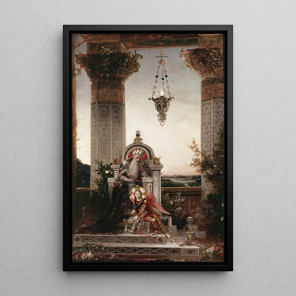 In "Le roi David" fängt Gustave Moreau die Größe und Komplexität einer ikonischen biblischen Figur ein. Die Komposition ist reich an Symbolik, mit tiefgründigen Farben und detaillierten Elementen, die die Noblesse des Königs unterstreichen. Moreau verwendet eine raffinierte Technik, die realistische Elemente mit Fantasieelementen verbindet und so eine Atmosphäre schafft, die sowohl feierlich als auch mystisch ist. Der durchdringende Blick Davids, umgeben von floralen Mustern und prächtigen Drapierungen, evoziert eine ruhige Kraft und lädt den Betrachter ein, über die Natur von Macht und Glauben nachzudenken.