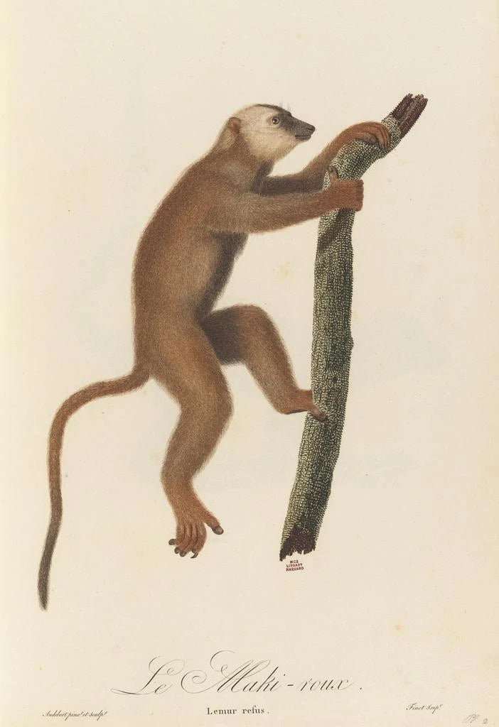 Der rotmaki, mit seinem auffälligen Gefieder und seinem schelmischen Ausdruck, ruft eine tiefe Verbindung zur Natur hervor. Jean-Baptiste Audebert gelingt es, die Energie und Lebendigkeit dieses Tieres in seiner kunstdruck einzufangen. Die Nuancen von Rot und Orange verschmelzen harmonisch und schaffen eine warme, dynamische Atmosphäre. Die sorgfältig gestaltete Komposition zieht den Blick auf sich und lädt zur Erkundung der Details ein. Jedes Element dieses Werks scheint zu vibrieren und zeugt vom Talent Audeberts, die wilde Schönheit einzufangen.