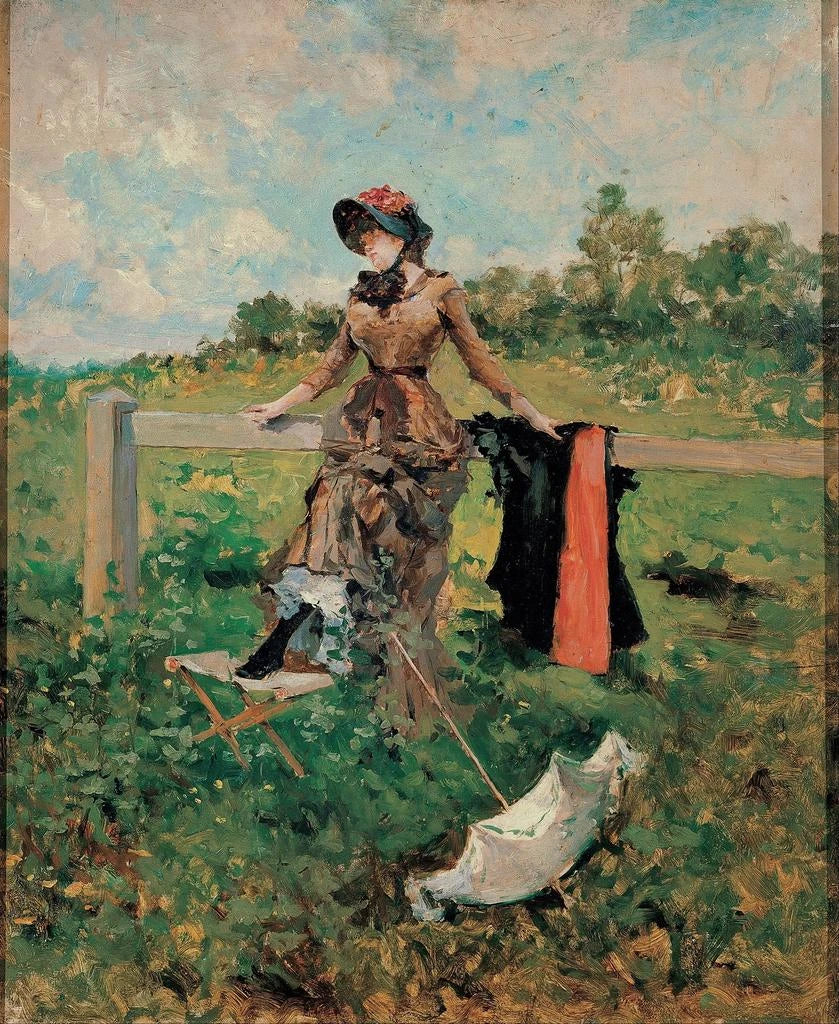 Die Dame mit dem Sonnenschirm, ein ikonisches Werk von Francesc Miralles i Galaup, verkörpert eine subtile Verschmelzung von Eleganz und visueller Poesie. Dieses Gemälde, das durch seine zarte Atmosphäre und seine raffinierte Lichtführung Aufmerksamkeit erregt, entführt den Betrachter in eine Welt der Träumerei und Kontemplation. Der Künstler fängt einen flüchtigen Moment ein, in dem Natur und Menschlichkeit aufeinandertreffen, und schafft so einen faszinierenden visuellen Dialog. Durch dieses Werk lädt Miralles uns ein, die Nuancen der vergänglichen Schönheit zu erkunden, während wir in ein reiches und immersives sensorisches Erlebnis eintauchen.