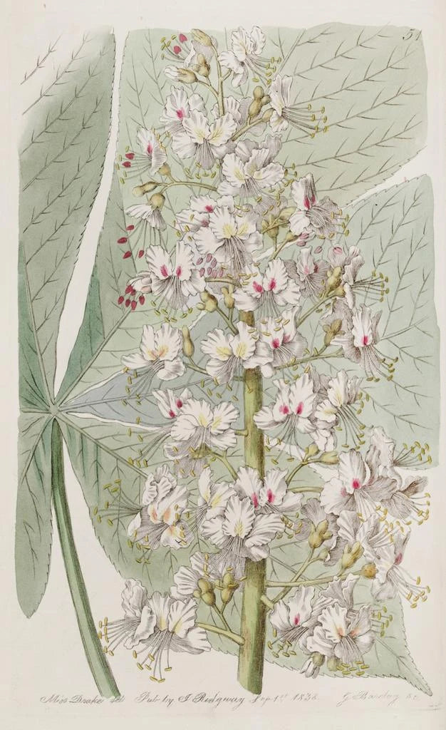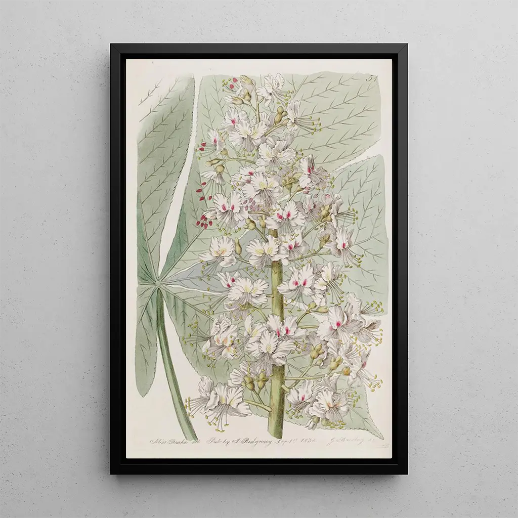 „Der Ohio-Kastanienbaum“ von Sydenham Edwards ist eine lebendige und detaillierte Darstellung dieses majestätischen Baumes. Die satten Grüntöne und Brauntöne sowie die leuchtend weißen Blumen schaffen eine harmonische Komposition, die den Blick fesselt. Die Aquarelltechnik, meisterhaft angewandt, ermöglicht es, Licht und Schatten subtil wiederzugeben und jedem Blatt und jeder Blume Leben einzuhauchen. Die Atmosphäre, die dieses Werk ausstrahlt, erinnert an die Ruhe der amerikanischen Landschaften und lädt den Betrachter ein, in die natürliche Schönheit dieses ikonischen Baumes einzutauchen.