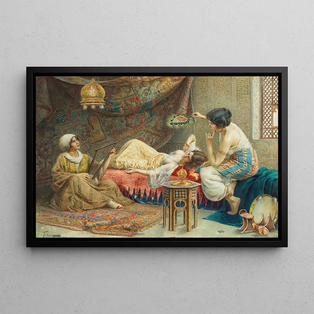 La Favorite du sultan : eine Reise in den Orientalismus „La favorite du sultan“ von Francesco Ballesio ist ein faszinierendes Werk, das den Betrachter in eine Welt voller Exotik und Geheimnis entführt. Dieses Gemälde, reich an Details, zeigt eine verzauberte Frau, gekleidet in prächtige Kleidung, umgeben von einer opulenten Kulisse. Die leuchtenden Farben und die kunstvollen Muster schaffen eine traumhafte Atmosphäre, in der sich Orient und Fantasie vermischen. Ballesio gelingt es mit seiner Meisterschaft in Texturen und Licht, die Essenz einer faszinierenden Epoche einzufangen und zur Kontemplation und Flucht einzuladen. Das Werk erinnert an Palastgeschichten und Leidenschaften und bietet einen Einblick in das Leben am Hof eines Sultans. Francesco Ballesio: der Künstler der orientalischen Träume Francesco Ballesio, aktiv im 19. Jahrhundert, ist ein Maler, dessen Werk dem orientalistischen Strom zugeordnet wird, einer künstlerischen Bewegung, die in dieser Zeit großen Erfolg hatte. Beeinflusst von Reisen und Berichten von Entdeckern, konnte Ballesio die Schönheit und Exotik orientalischer Kulturen einfangen. Seine Gemälde, oft bevölkert von weiblichen Figuren, zeugen von einer Faszination für den Orient, während sie gleichzeitig die romantischen Sehnsüchte seiner Zeit widerspiegeln. „La favorite du sultan“ ist emblematisch für diese Periode, in der Künstler versuchten, der westlichen Realität zu entfliehen und ferne, verzauberte Welten zu erkunden. Eine dekorative Anschaffung mit vielfältigen Vorzügen Der kunstdruck von „La favorite du sultan“ ist ein dekoratives Stück, das Ihren Wohnraum bereichern wird, egal ob modern oder traditionell. Seine elegante Ästhetik und die leuchtenden Farben machen ihn zu einem idealen Bild für ein Wohnzimmer, ein Esszimmer oder sogar ein Büro. Die Qualität des kunstdrucks garantiert eine detailgetreue Wiedergabe und die Atmosphäre des Originalwerks, sodass Sie die Kunst von Ballesio voll genießen können. Mit diesem Leinwandbild verleihen Sie Ihrer Inneneinrichtung einen Hauch von Eleganz und Geheimnis und feiern gleichzeitig das Erbe des Orientalismus.