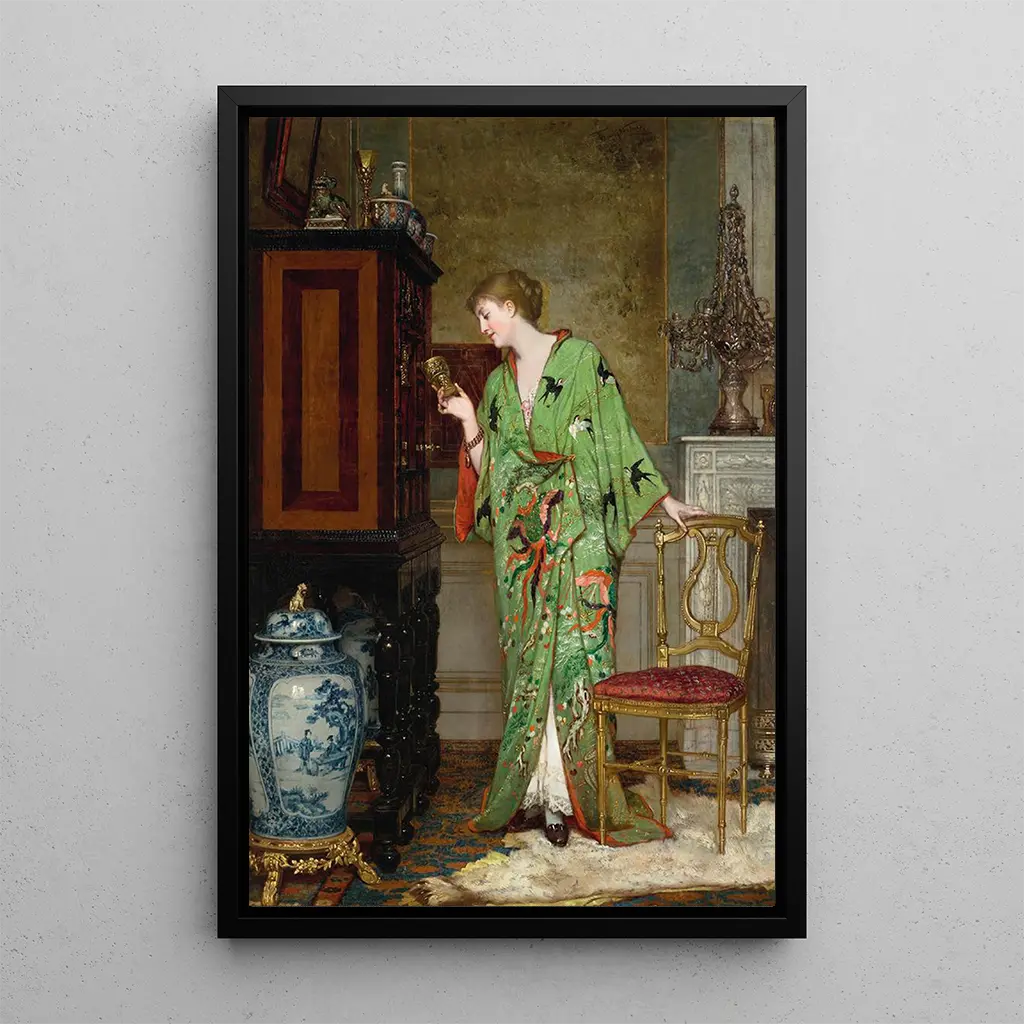 „Die Sammlung im grünen Kimono“ von Jan Verhas ist ein fesselndes Werk, das die Anmut und Eleganz der weiblichen Schönheit feiert. Die Komposition hebt eine Frau hervor, die einen reich verzierten Kimono trägt, umgeben von Kunstobjekten, die ihren feinen Geschmack widerspiegeln. Die leuchtenden Farben und die detaillierten Feinheiten schaffen eine lebendige Atmosphäre, in der jedes Element eine Geschichte zu erzählen scheint. Die Technik von Verhas, die Realismus und Feinheit verbindet, ermöglicht es, die Textur der Stoffe und die Zartheit der Accessoires zu spüren und den Betrachter in eine Welt voller Schönheit und Raffinesse einzutauchen.