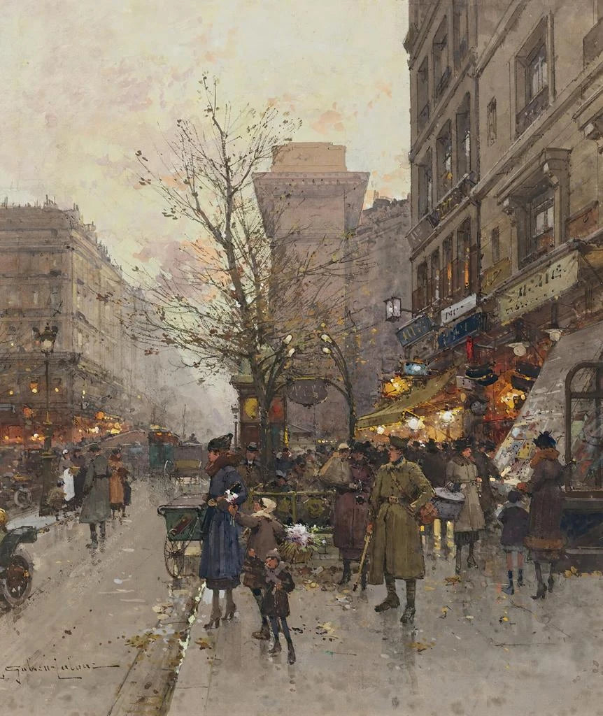 Eugène Galien-Laloue, geboren 1854, war ein französischer Maler, der sein Leben der Darstellung der städtischen Landschaften und Denkmäler von Paris gewidmet hat. Sein Werk ist im postimpressionistischen Strom verankert, wurde aber auch von den Techniken der Impressionisten beeinflusst. Seine Liebe zur Stadt des Lichts spiegelt sich in jedem seiner Werke wider. Galien-Laloue hat sich als Meister der urbanen Malerei etabliert, und seine Werke sind heute bei Sammlern und Kunstliebhabern sehr begehrt. Sein einzigartiger Ansatz von Licht und Farbe hat den Weg für viele Künstler geebnet, die ihm gefolgt sind. Indem er bedeutende Orte feiert