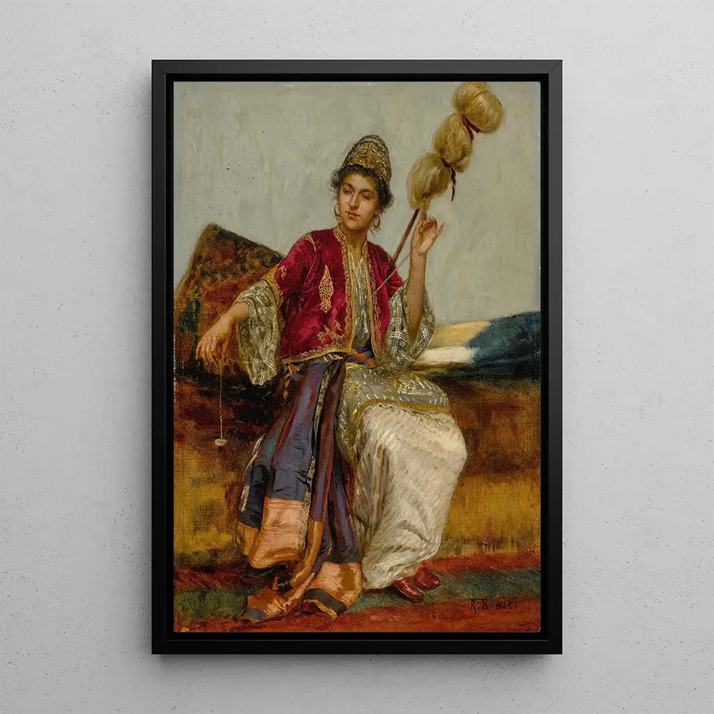 In "La Fileuse" taucht Rudolf Ernst uns ein in eine Welt voller Gelassenheit und Schönheit. Das Leinwandbild zeigt eine konzentrierte Frau, die mit vollem Einsatz spinnt, umgeben von einem sanften Licht, das die Details ihres Gesichts und ihrer Kleidung hervorhebt. Die warmen Farben, dominiert von Erdtönen und Gold, schaffen eine warme und intime Atmosphäre. Die Technik des Künstlers, die Realismus und impressionistische Akzente verbindet, erweckt diese Alltagsszene zum Leben und lädt den Betrachter ein, innezuhalten und die Schönheit einfacher Gesten zu schätzen. Das Werk erinnert an eine Zeit, in der handwerkliche Arbeit geschätzt wurde und jeder Bewegung Bedeutung hatte.
