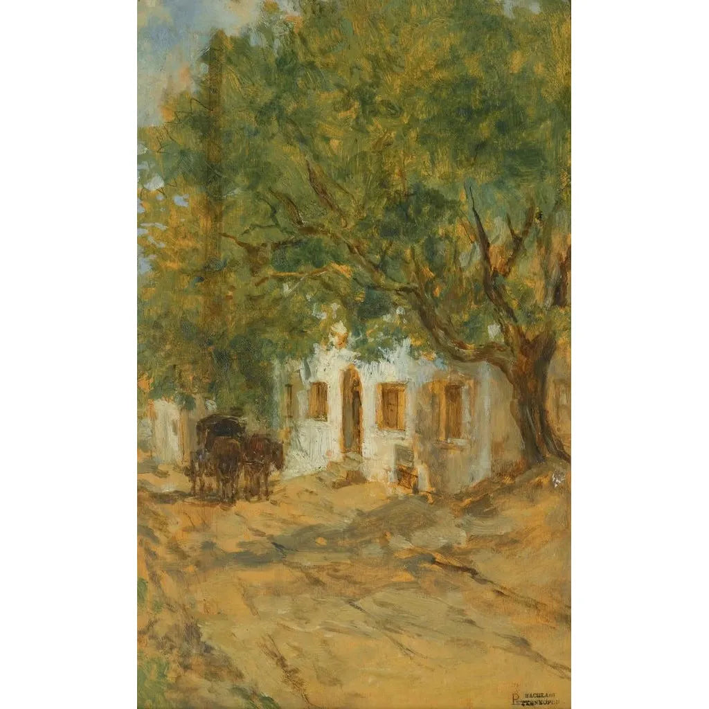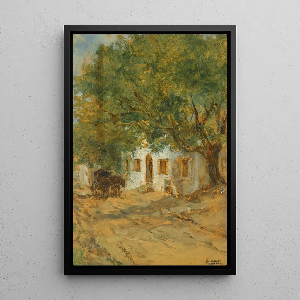 In "Eine Dorfsstraße" fängt August von Pettenkofen das Wesen eines friedlichen Alltags ein, in dem das Licht auf den Fassaden der Häuser spielt und die Figuren unter den Blicken des Betrachters zu leben scheinen. Die warmen, erdigen Farben vermitteln eine einladende Atmosphäre, während die Ölmaltechnik die Details zum Leben erweckt, von den Pflastersteinen bis zu den Schatten der Bäume. Dieses Gemälde lädt zu einer sanften Betrachtung ein, bei der jedes Element eine Geschichte erzählt und die Zeit stillzustehen scheint, um einen Blick in eine vergangene Epoche zu gewähren.