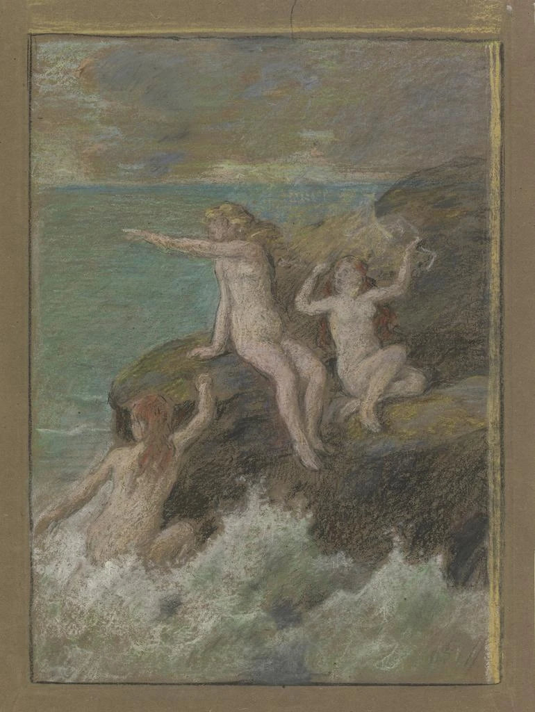 Drei nackte Frauen auf einem Felsen - Otto Scholderer