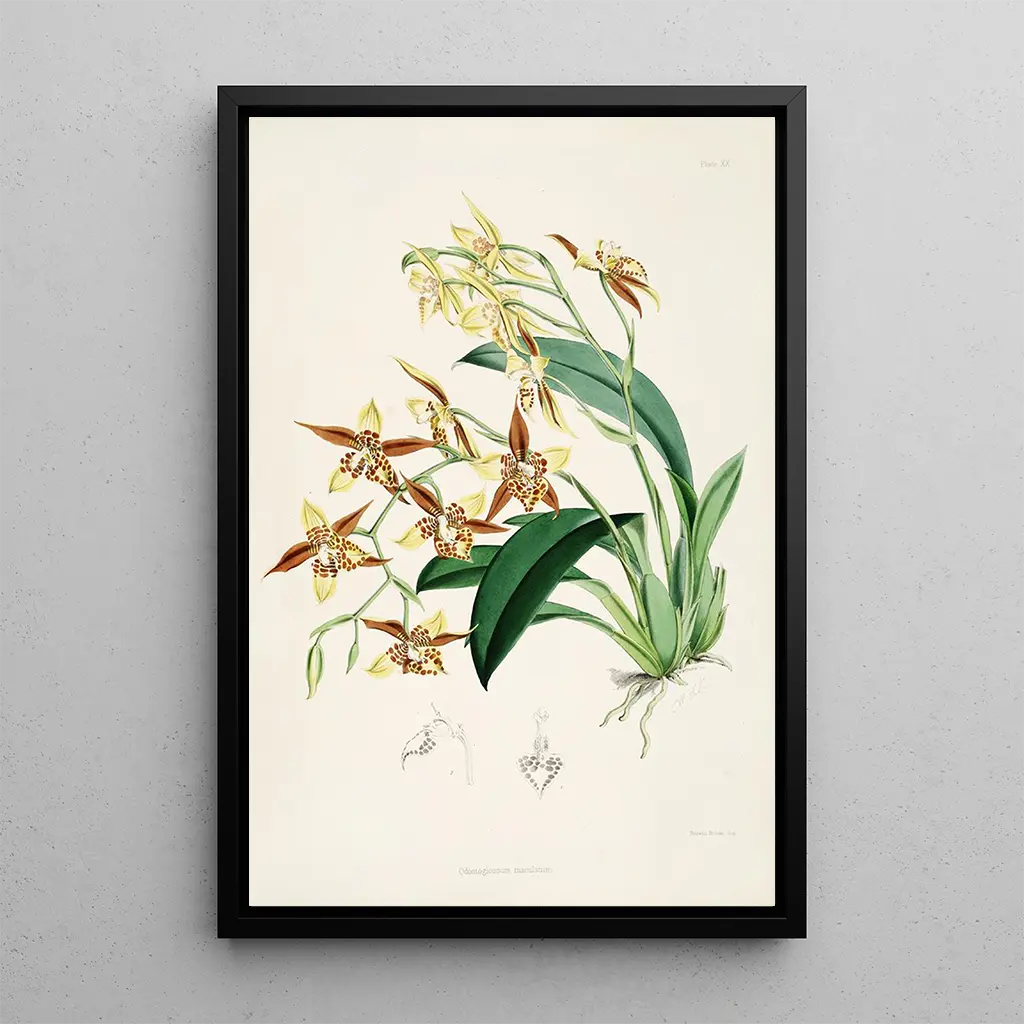Die reproduction von Odontoglossum Pl19 ist eine wahre Ode an die Schönheit der Orchideen. Dieses Gemälde, reich an Details, fängt die Eleganz der Blumen mit einer Farbpalette ein, die von strahlendem Gelb bis zu tiefem Violett reicht. Die Aquarelltechnik, meisterhaft vom Künstler beherrscht, ermöglicht es, die Zartheit der Blütenblätter und die Komplexität der Formen wiederzugeben. Die Atmosphäre, die dieses Werk ausstrahlt, ist sowohl beruhigend als auch inspirierend und lädt den Betrachter ein, in eine Welt einzutauchen, in der die Natur Königin ist. Jeder Pinselstrich scheint eine Geschichte zu erzählen, die der vergänglichen Schönheit der Blumen.