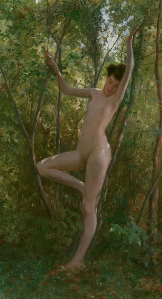 In "Eine Nymphe des Waldes" taucht Julius LeBlanc Stewart uns in eine verzauberte Welt ein, in der die Schönheit der Natur mit weiblicher Anmut verschmilzt. Die Komposition wird von grünen und braunen Tönen dominiert, die den üppigen Wald hervorrufen. Das sanfte Licht dringt durch die Blätter und schafft eine ruhige, fast mystische Atmosphäre. Die Nymphe, gekleidet in ein leichtes Kleid, scheint mit den Schatten und Lichtern zu tanzen und verkörpert den Geist der Natur. Die Technik von Stewart, die Realismus und Impressionismus verbindet, erweckt jedes Detail zum Leben, von zarten Blättern bis zu den Reflexionen auf der Haut der zentralen Figur, und lädt den Betrachter zu einer längeren Betrachtung ein.