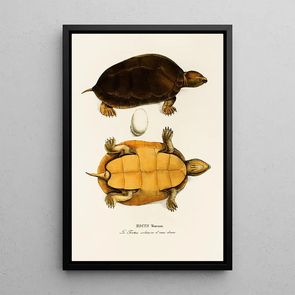 Emys Tracaxa : ein Porträt der aquatischen Biodiversität "Emys Tracaxa", Werk von Johann Baptist von Spix, ist eine faszinierende Darstellung einer Süßwassertortue, die die Essenz des aquatischen Lebens einfängt. Das Leinwandbild besticht durch seine leuchtenden Farbtöne und präzisen Details, die die Textur des Panzers und die Wasserreflexionen hervorheben. Die Aquarelltechnik, die mit Feinfühligkeit angewendet wird, schafft eine leichte und dynamische Atmosphäre, die den Betrachter einlädt, in dieses reiche Ökosystem einzutauchen. Jeder Pinselstrich scheint das Leben zu atmen und ehrt die zerbrechliche Schönheit dieser Kreaturen. Johann Baptist von Spix : ein Entdecker im Dienste der Wissenschaft Johann Baptist von Spix, Naturforscher und Entdecker des frühen 19. Jahrhunderts, ist bekannt für seine vertieften Studien zur brasilianischen Fauna und Flora. Sein Werk, "Emys Tracaxa", steht in einem Kontext, in dem Wissenschaft und Kunst sich verbinden, und zeigt die Leidenschaft des Künstlers für die Natur. Beeinflusst von den Idealen der Romantik, konnte Spix eine sorgfältige Beobachtung mit ästhetischer Sensibilität verbinden. Seine Arbeit hat nicht nur das zoologische Wissen seiner Zeit bereichert, sondern auch ein nachhaltiges Interesse an der Biodiversität geweckt, was ihn zu einer ikonischen Figur der wissenschaftlichen Erforschung macht. Eine dekorative Anschaffung mit vielfältigen Vorzügen Der Kunstdruck von "Emys Tracaxa" ist eine kluge dekorative Wahl, um Ihr Interieur zu verschönern, sei es im Wohnzimmer, im Büro oder im Schlafzimmer. Seine Druckqualität garantiert eine bemerkenswerte Treue zu den Details des Originalwerks und bringt einen Hauch von Natur und Ruhe in Ihren Raum. Dieses Bild, mit seinem unbestreitbaren ästhetischen Reiz, wird die Aufmerksamkeit Ihrer Gäste auf sich ziehen und bereichernde Gespräche anregen. Mit der Wahl dieses Leinwandbildes treffen Sie die Entscheidung für ein Stück, das Schönheit, Wissenschaft und Umweltbewusstsein vereint.