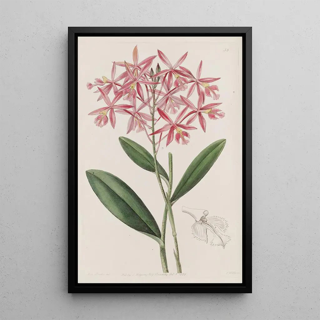 Das Werk "Epidendrum von M. Schomburgk" von Sydenham Edwards entführt uns in eine üppige Welt, in der die Natur mit Brillanz zum Ausdruck kommt. Diese botanische Illustration, mit bemerkenswerter Präzision gefertigt, hebt die zarten Details der Orchideenblüten hervor. Die lebendigen Töne von Grün, Rosa und Gelb vermischen sich harmonisch und schaffen eine Atmosphäre, die sowohl lebendig als auch beruhigend ist. Die Aquarelltechnik, meisterhaft angewandt, fängt das Licht und die Textur der Blütenblätter ein und vermittelt so ein Gefühl von Tiefe und Realismus. Jeder Pinselstrich scheint die Geschichte dieser faszinierenden Pflanze zu erzählen und lädt den Betrachter ein, sich an der Schönheit der Natur zu erfreuen.