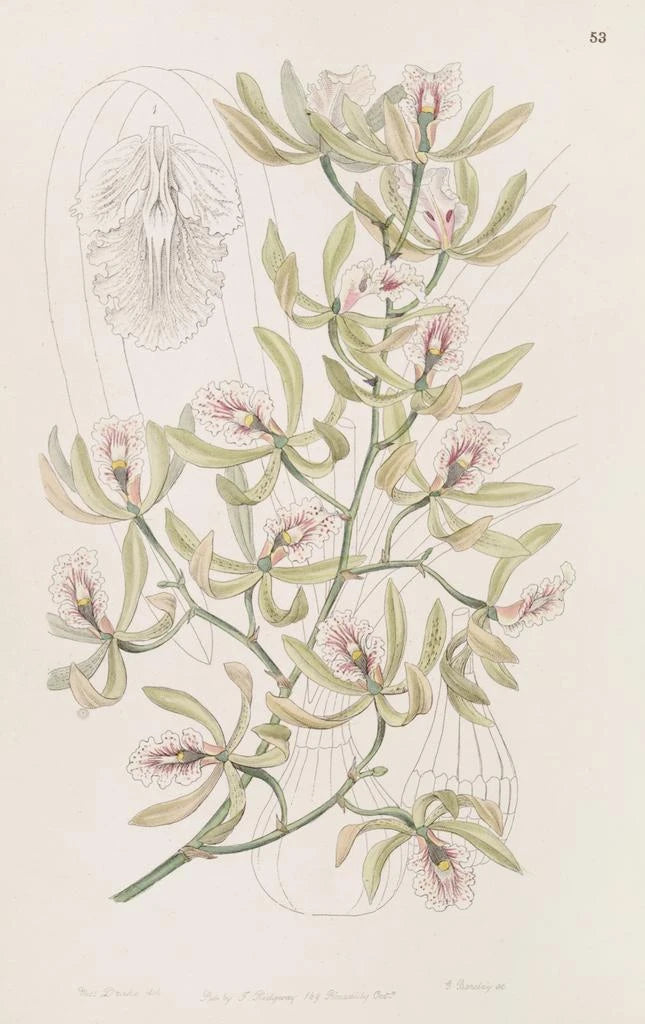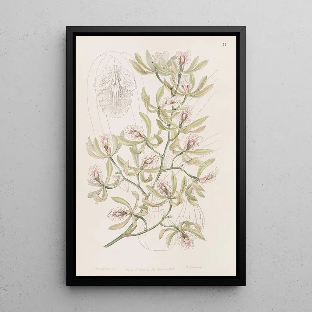 Der Épidendrum flügel, mit seinen zarten Blütenblättern und lebendigen Farben, ruft eine Welt natürlicher Schönheit hervor. Dieses Werk von Sydenham Edwards fängt die Essenz tropischer Flora ein, wobei jedes Detail sorgfältig wiedergegeben wird. Die Nuancen von Grün und Rosa verschmelzen harmonisch und schaffen eine Atmosphäre, die sowohl ruhig als auch dynamisch ist. Die Gravurtechnik, präzise angewandt, hebt die Textur der Blumen und Blätter hervor und lädt den Betrachter ein, in diese botanische Welt einzutauchen. Das Werk scheint vor Leben zu vibrieren, als ob jede Blume bereit wäre, unter unseren Augen zu erblühen.