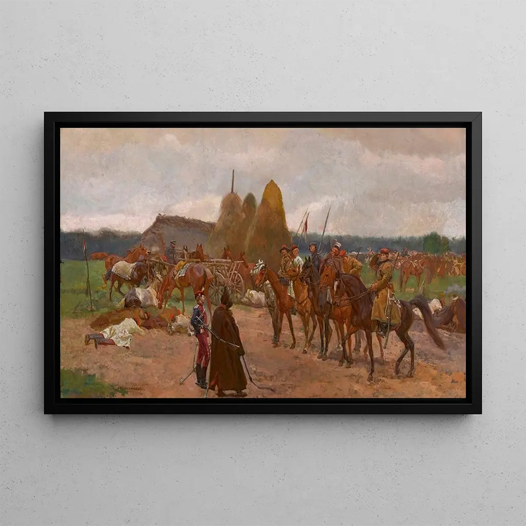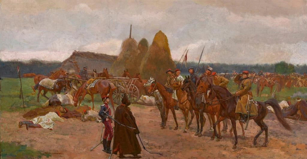 "Episode des Aufstands" von Józef Chełmoński ist ein kraftvolles Werk, das die Intensität eines Moments des Aufstands einfängt. Die Leinwand, reich an Details und Emotionen, zeigt eine dramatische Szene, in der die Figuren in einem erbitterten Kampf verharren. Die dunklen Farben und die eindrucksvollen Kontraste verstärken die Spannung der Komposition, während Chełmońskis Technik, die Realismus und Expressionismus verbindet, dieser historischen Darstellung Leben einhaucht. Die Atmosphäre ist voller Leidenschaft und Entschlossenheit, was den Betrachter einlädt, die Hingabe der Protagonisten zu spüren.