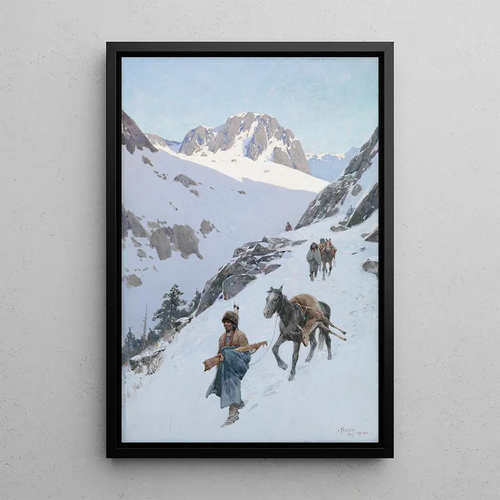 In der Kunstdruckversion von "Eine erfolgreiche Jagd" zeigt Henry Farny meisterhaft die Geschicklichkeit und Entschlossenheit der indianischen Jäger. Die warmen, erdigen Farben, kombiniert mit Lichtakzenten, schaffen eine dynamische und lebendige Atmosphäre. Die Komposition hebt die Bewegung der Figuren hervor und fängt die Essenz der Aktion und der Aufregung ein, die bei einer Jagd herrschen. Jedes Detail, von den Federn auf den Kopfbedeckungen bis zu den stolzen Ausdrücken auf den Gesichtern, zeugt von Farnys technischer Meisterschaft, der es gelingt, eine emotionale Geschichte zu vermitteln.