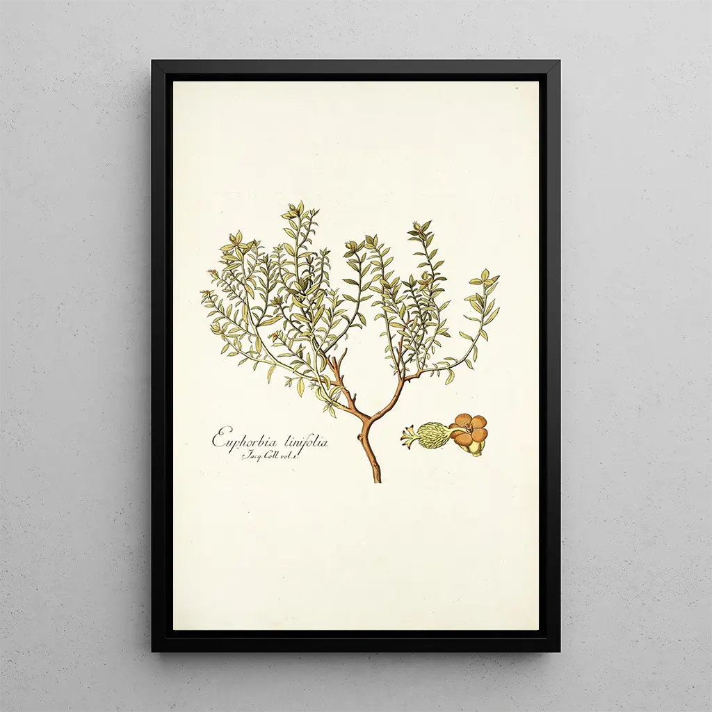 Das Werk "Euphorbia linifolia" von Nikolaus Joseph Freiherr von Jacquin präsentiert sich als wahres Lob der Schönheit der Pflanzen. Diese kunstdruck hebt die Zartheit der Formen und die Farbvielfalt hervor, die diese Euphorbienart kennzeichnen. Die Komposition ist sorgfältig ausgearbeitet, jedes Detail der Pflanze wird minutiös dargestellt, was eine sowohl beruhigende als auch belebende Atmosphäre schafft. Die lebendigen Grüntöne, ergänzt durch sanftere Nuancen, erinnern an das natürliche Licht, das diese Gewächse durchflutet, und laden den Betrachter zu einer aufmerksamen und respektvollen Betrachtung der Natur ein.