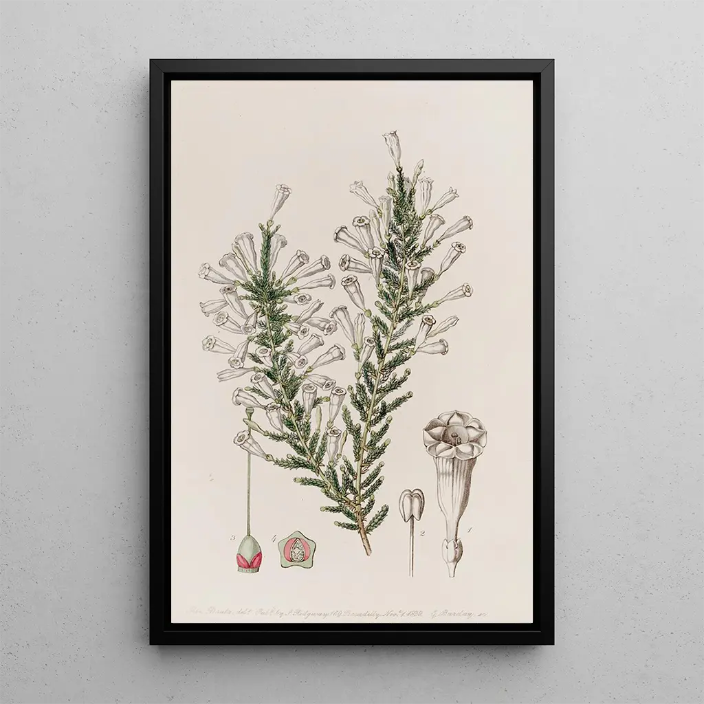 Die kunstdruck Fabiana imbriquée von Sydenham Edwards ist ein Werk, das die Zartheit und den Reichtum der Natur evoziert. Die lebendigen Töne von Grün und Rosa verschmelzen zu einer harmonischen Komposition, bei der jedes Detail zum Leben erwacht. Die Aquarelltechnik, die meisterhaft eingesetzt wird, verleiht dem Gesamtwerk Leichtigkeit, während die präzisen Konturen der Blumen ihre vergängliche Schönheit unterstreichen. Dieses Gemälde lädt zur Betrachtung ein und entführt den Betrachter in einen üppigen Garten, in dem die Flora in ihrer ganzen Pracht erblüht.