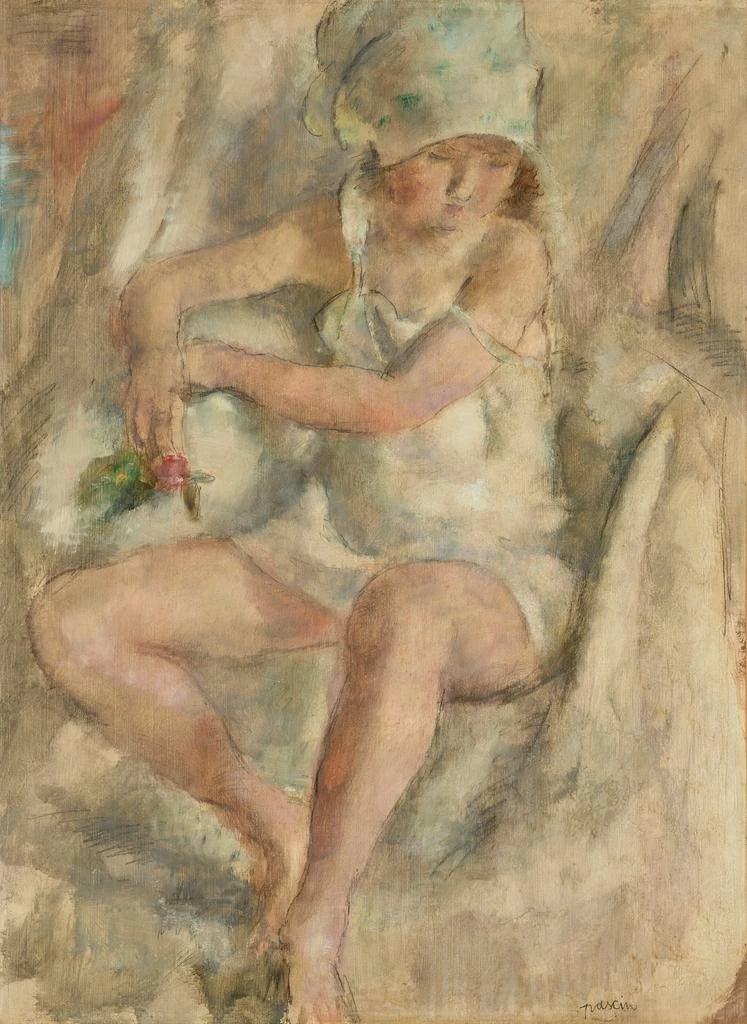 Jules Pascin, Künstler bulgarischer Herkunft, prägte den Beginn des 20. Jahrhunderts mit seinem einzigartigen Stil, der europäische und amerikanische Einflüsse verbindet. In Montmartre in der Kunstszene aktiv, etablierte er sich als einer der Vorreiter des Modernismus und erforschte Themen wie das Nachtleben und die weibliche Condition. Seine Werke, oft von Melancholie und Sinnlichkeit geprägt, spiegeln eine Suche nach Identität und Emotion wider. "Femme au turban avec rose" zeigt sein Talent, die vergängliche Schönheit und die Komplexität der Frauen seiner Zeit einzufangen.