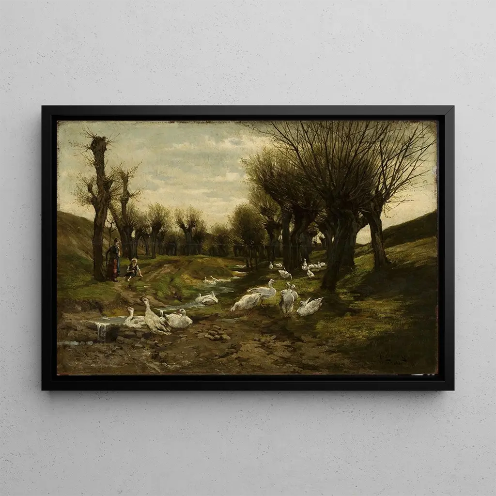 Oies le long d'un ruisseau : eine idyllische Szene voller Gelassenheit In dieser kunstdruckversion von Oies le long d'un ruisseau fängt Richard Lorenz die ruhige Schönheit der Natur ein. Die gänse, majestätisch und gelassen, bewegen sich entlang eines friedlichen Flusses, während das Sonnenlicht auf den Wasserreflexen spielt. Die sanften und natürlichen Farben, die von beruhigenden Grüntönen bis zu kristallklarem Blau reichen, schaffen eine Atmosphäre der Ruhe und Kontemplation. Lorenz' Technik, die Realismus und Impressionismus verbindet, lädt den Betrachter ein, in diese idyllische Szene einzutauchen, in der jedes Detail, von den Federn der Gänse bis zu den Wellen des Wassers, sorgfältig beobachtet wird. Richard Lorenz: ein Meister der Landschaftsmalerei im 19. Jahrhundert Richard Lorenz, deutscher Maler des 19. Jahrhunderts, ist bekannt für seine Fähigkeit, die Schönheit natürlicher Landschaften zu verewigen. Beeinflusst von der romantischen Bewegung, widmete er sich der Darstellung der Natur und suchte, durch seine Werke Emotionen hervorzurufen. Sein Stil, geprägt von einer sorgfältigen Detailarbeit und einer harmonischen Farbpalette, spiegelt die Bedeutung der Natur in der Kunst seiner Zeit wider. Lorenz konnte die Essenz europäischer Landschaften einfangen, und sein Beitrag zur Landschaftsmalerei bleibt bedeutend, was ihn zu einem unverzichtbaren Künstler für Kunstliebhaber macht. Eine dekorative Anschaffung mit vielfältigen Vorzügen Der kunstdruck von Oies le long d'un ruisseau ist ein ideales Dekorationsstück für verschiedene Räume, sei es im Wohnzimmer, im Büro oder im Schlafzimmer. Seine Druckqualität und Treue zum Originalwerk garantieren eine unbestreitbare ästhetische Anziehungskraft. Dieses Bild bringt einen Hauch von Natur und Gelassenheit in Ihr Zuhause und regt gleichzeitig Gespräche über Kunst und die Schönheit der natürlichen Welt an. Mit diesem Leinwandbild entscheiden Sie sich für ein Werk, das nicht nur Ihren Raum verschönert, sondern auch ein Gefühl von Frieden und Ruhe vermittelt.