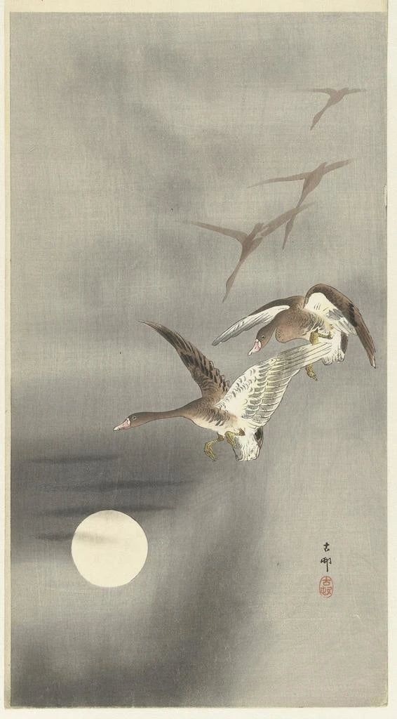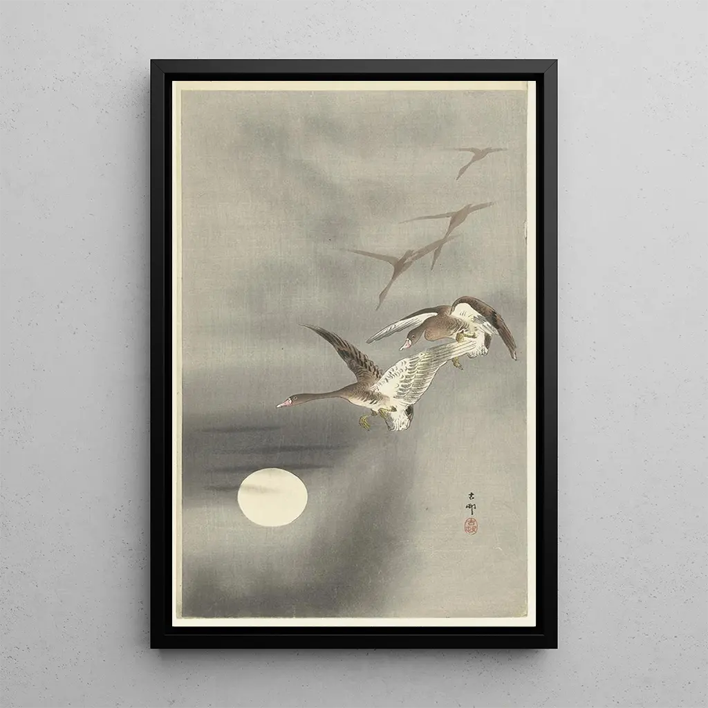 Oies en vol : eine anmutige Lufttanzperformance L'œuvre "Oies en vol" von Ohara Koson fängt einen flüchtigen Moment in der Natur ein, in dem majestätische Gänse in den Himmel aufsteigen. Die zarten Nuancen von Blau und Weiß verschmelzen harmonisch und schaffen eine ruhige, poetische Atmosphäre. Die Technik des Ukiyo-e-Holzschnitts ermöglicht es, die Leichtigkeit der fliegenden Vögel darzustellen, während die detaillierten Federn einen Hauch von Realismus hinzufügen. Diese kunstdruck vermittelt ein Gefühl von Freiheit und Frieden und lädt den Betrachter ein, in eine bezaubernde Naturlandschaft einzutauchen. Ohara Koson : ein Meister des japanischen Holzschnitts Ohara Koson, aktiv im frühen 20. Jahrhundert, ist bekannt für seine ikonischen Werke, die die Schönheit der Natur und der Tiere feiern. Beeinflusst von den Traditionen des japanischen Holzschnitts, vereinte er Modernität mit alten Techniken und zeichnete sich durch seinen einzigartigen Stil aus. Koson hat häufig Vögel, Blumen und Landschaften dargestellt, was seine tiefe Bewunderung für seine Umwelt widerspiegelt. Seine Arbeiten hatten einen bedeutenden Einfluss auf die japanische Kunst und trugen zur Verbreitung der japanischen Ästhetik auf internationaler Ebene bei, was ihn zu einer unverzichtbaren Figur seiner Zeit macht. Eine dekorative anschaffung mit vielfältigen vorteilen Der kunstdruck "Oies en vol" ist ein ideales Dekorationsstück, um Ihrem Zuhause eine elegante Note zu verleihen. Ob im Wohnzimmer, im Büro oder im Schlafzimmer, dieses Bild wird durch seine Schönheit und Feinheit begeistern. Die Druckqualität garantiert eine bemerkenswerte Treue zu den Details des Originalwerks, während sein ästhetischer Reiz es zu einem faszinierenden Gesprächsthema macht. Durch die Integration dieses Leinwandbildes in Ihre Dekoration bringen Sie einen Teil der japanischen Kultur in Ihr Zuhause und schaffen gleichzeitig eine beruhigende und inspirierende Atmosphäre.