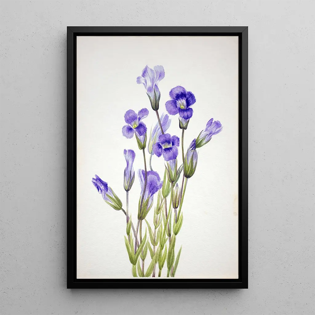 Die Gentiane frangée, oder Gentiana elegana, zeigt sich in einer zarten Komposition, bei der die Nuancen von Blau und Violett sich mit bemerkenswerter Feinheit verweben. Die Blütenblätter, mit einer fast samtartigen Textur, fangen das Licht ein und erzeugen ein Spiel aus Schatten und Reflexionen, das die Sanftheit alpiner Landschaften evoziert. Mary Vaux Walcott gelingt es durch ihre akribische Technik, diese Blume in ihrer ganzen Pracht zu verewigen und eine beruhigende, kontemplative Atmosphäre zu schaffen. Jedes Detail, von den Nerven der Blätter bis zu den Konturen der Blüten, zeugt von tiefem Respekt vor der Natur und einer Leidenschaft für die Beobachtung.
