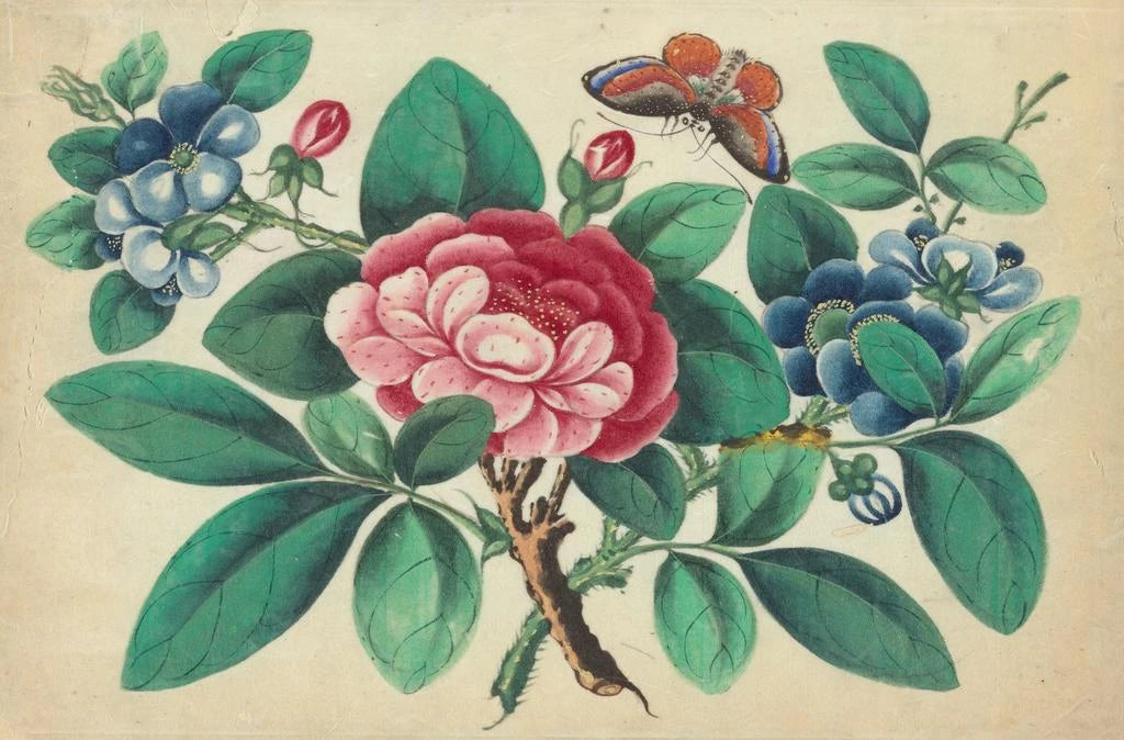 Große Rote Blume, Blaue Blumen, Schmetterling - Anonym