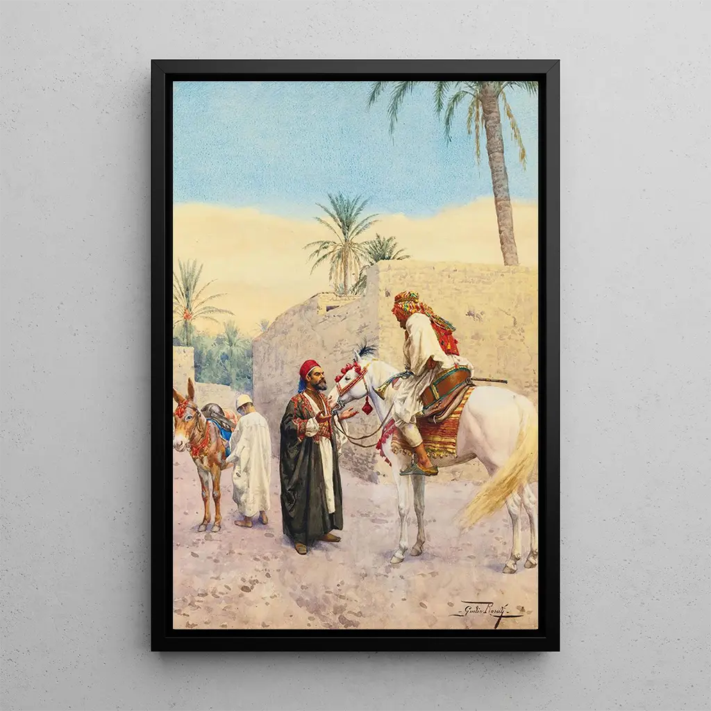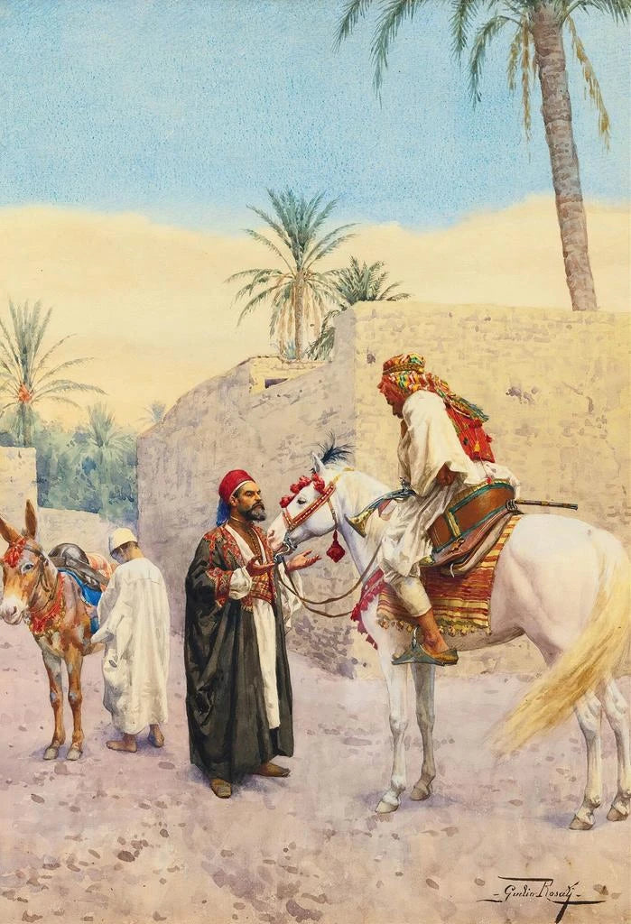Giulio Rosati, aktiv im 19. Jahrhundert, ist ein italienischer maler, dessen Werke durch ihre Detailgenauigkeit und ihre Fähigkeit, die Essenz des täglichen Lebens einzufangen, hervorstechen. Beeinflusst von der orientalistischen Bewegung, hat er es verstanden, Elemente verschiedener Kulturen in seine Kreationen zu integrieren und so der menschlichen Vielfalt Tribut zu zollen. Rosati hat häufig Themen im Zusammenhang mit Intellekt und Kultur erforscht, wie es bei "Mots bien choisis" zu sehen ist. Dieses Werk zeigt nicht nur sein technisches Talent, sondern auch sein Engagement, Momente der Reflexion und Kreativität darzustellen, und macht ihn zu einem unverzichtbaren Künstler seiner Zeit.