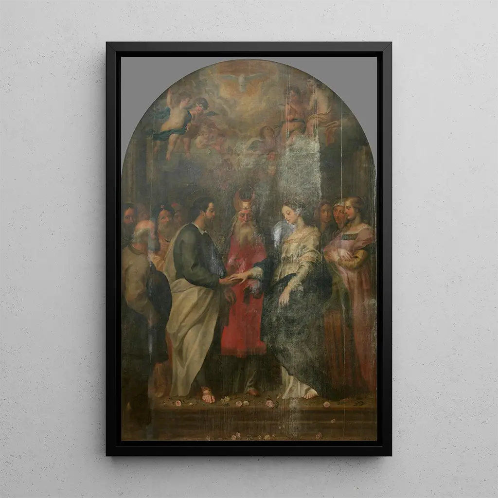 In "Mariage de Marie" bietet Gerard Seghers eine emotionale Darstellung eines heiligen Moments, in dem Liebe und Hingabe aufeinandertreffen. Dieses reich farbige Gemälde zeigt majestätische Figuren, umgeben von einer Atmosphäre der Feierlichkeit und Freude. Die feinen Details der Kleidung und die Ausdrücke der Figuren sind sorgfältig ausgearbeitet und schaffen eine lebendige, berührende Szene. Das sanfte Licht, das die Komposition durchflutet, betont die Spiritualität des Ereignisses und lädt den Betrachter ein, die Tiefe dieses bedeutenden Moments im Leben Mariens zu spüren.
