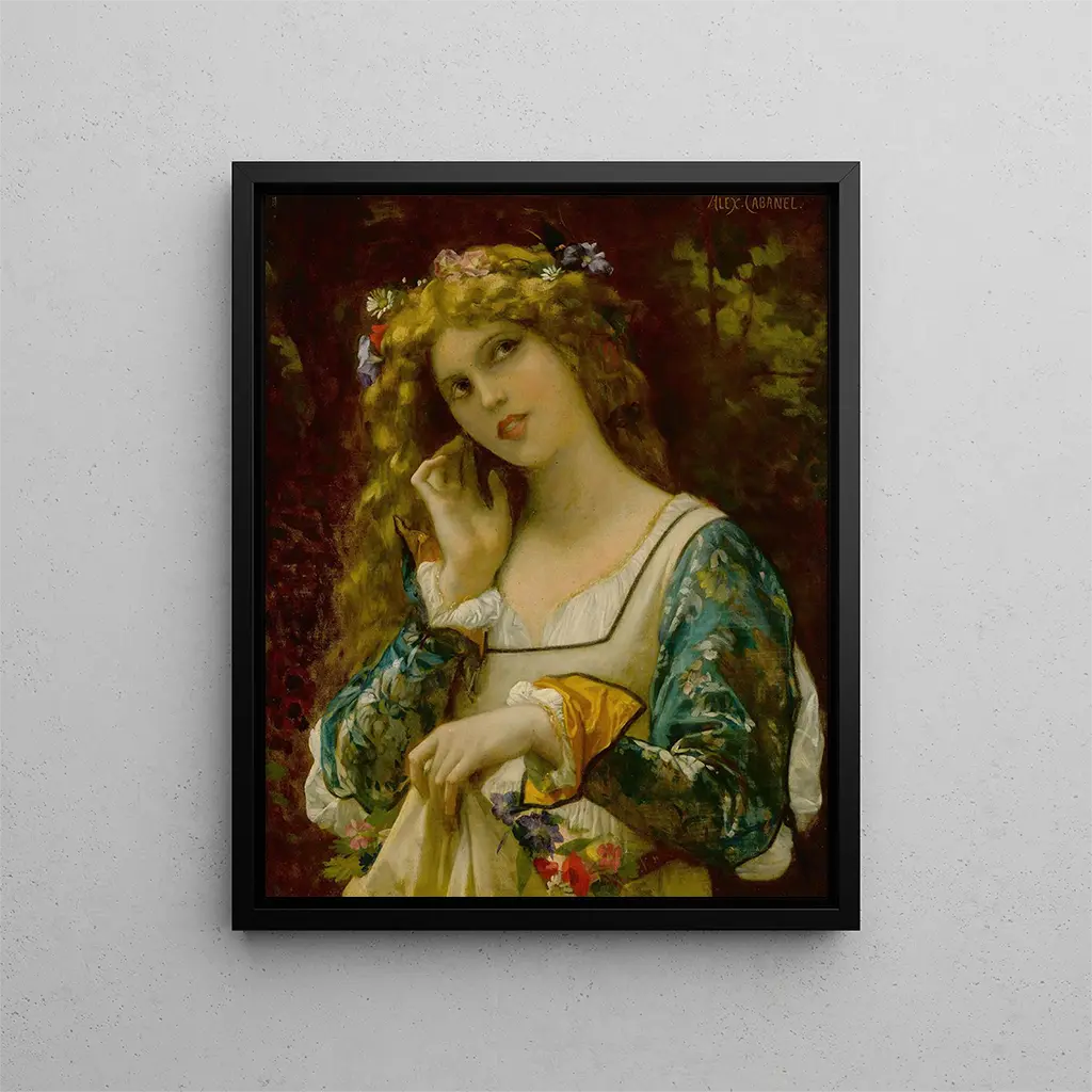 Reproduktion Écoutant La Voix D'écho - Alexandre Cabanel – Fesselnde Einführung Im weiten Panorama der Kunstgeschichte hallen bestimmte Werke mit besonderer Intensität wider, fesseln Geist und Fantasie der Betrachter. "Écoutant La Voix D'écho" von Alexandre Cabanel ist eines dieser Kreationen, die den reinen Status eines Kunstwerks übersteigen und zu einem wahren sensorischen Erlebnis werden. Dieses Gemälde, das sowohl Schönheit als auch Melancholie evoziert, taucht den Betrachter in ein Universum, in dem Mythologie auf menschliche Empfindsamkeit trifft. Durch diesen Kunstdruck richtet sich der Blick auf eine Szene voller Poesie, in der jedes Detail scheint, Geheimnisse einer vergangenen Zeit zu murmeln. Stil und Einzigartigkeit des Werks Das Werk von Alexandre Cabanel zeichnet sich durch seinen akademischen Stil aus, der durch eine beeindruckende technische Meisterschaft geprägt ist. In "Écoutant La Voix D'écho" setzt der Maler eine Palette zarter Farben ein, bei der die Nuancen von Haut mit dunkleren Tönen verschmelzen und einen subtilen Kontrast schaffen, der die Emotion des Gemäldes verstärkt. Die weibliche Figur, im Zentrum der Komposition, wird mit Anmut und Sinnlichkeit dargestellt, die das unübertroffene Talent Cabanel bezeugen. Ihr Blick, zugleich nachdenklich und fasziniert, scheint mit dem fernen Echo zu dialogisieren, das sie umgibt, und lädt den Betrachter ein, diesen Moment der Introspektion zu teilen. Die minutösen Details, von den Wellen ihrer Haare bis zu den Falten ihrer Drapierung, zeugen von einer Aufmerksamkeit für Schönheit und Harmonie, den Merkmalen der romantischen Bewegung, deren leidenschaftlicher Vertreter Cabanel war. Der Künstler und sein Einfluss Alexandre Cabanel, geboren 1823, ist eine der ikonischen Figuren des 19. Jahrhunderts, einer Epoche, die von künstlerischen und sozialen Umbrüchen geprägt ist. Schüler der École des beaux-arts in Paris, konnte er sich als Meister des Porträts und der Historienmalerei etablieren. Sein Werk, reich an Symbolismus und Emotion, hat zahlreiche Künstler seiner Zeit und nachfolgende Generationen beeinflusst. Cabanel vermochte es, die Essenz von Schönheit einzufangen, sowohl physisch als auch spirituell, und sein Einfluss ist noch immer in der zeitgenössischen Kunst spürbar. "Écoutant La Voix D'écho" verkörpert diese Suche nach der