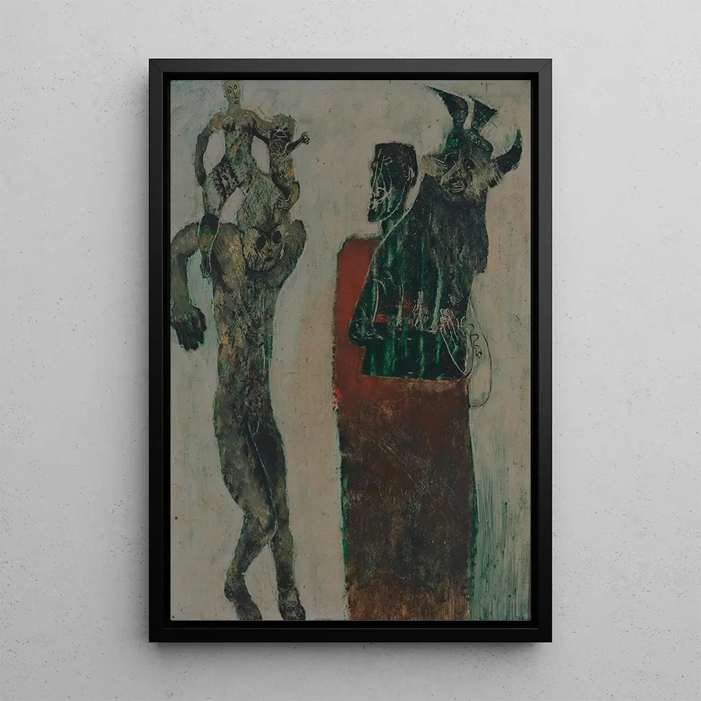 "Idoles hantées" von Frits van den Berghe ist ein fesselndes kunstdruck, das die Vorstellung von Identität durch ikonische Figuren und symbolische Motive hinterfragt. Die Farbpalette, die zwischen dunklen Nuancen und leuchtenden Akzenten schwankt, schafft eine Atmosphäre, die sowohl geheimnisvoll als auch verstörend ist. Die Figuren, oft in ausdrucksstarken Posen eingefroren, scheinen das Gewicht ihrer Geschichte zu tragen und wecken vergrabene Erinnerungen. Die Technik des Künstlers, die geschickt Abstraktion und Figuration verbindet, verstärkt die emotionale Wirkung dieses Leinwandbildes und lädt den Betrachter zu einer tiefen Selbstreflexion ein.