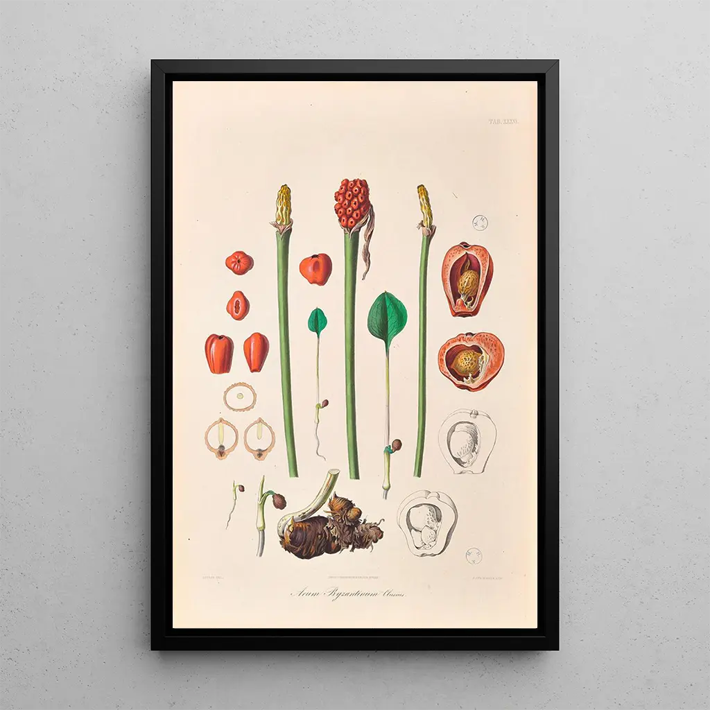 Das Werk "Icones Aroidearum Pl36" von Heinrich Wilhelm Schott ist eine faszinierende Illustration, die die Vielfalt und Komplexität der Aroidenpflanzen hervorhebt. Mit einer reichen Farbpalette und präzisen Details lädt dieses Kunstwerk zu einer tiefgehenden Betrachtung der Natur ein. Jedes Blatt, jeder Stängel ist mit einer Sorgfalt dargestellt, die die aufmerksame Beobachtung des Künstlers widerspiegelt. Die Atmosphäre, die von diesem Gemälde ausgeht, ist sowohl ruhig als auch dynamisch und spiegelt die Vitalität der Pflanzenarten wider, die es zeigt.