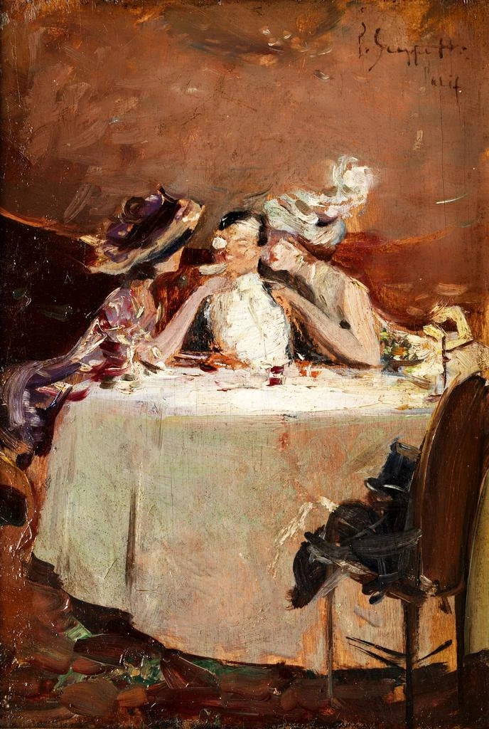 In "Au café" fängt Pietro Scoppetta die Essenz des italienischen Alltagslebens ein. Die dynamische Komposition, bei der menschliche Figuren sich mit Tischen und Stühlen verweben, schafft eine freundliche Atmosphäre. Die warmen Farben, von Ockertönen bis zu tiefroten Nuancen, rufen die Wärme der mediterranen Sonne hervor. Die Technik von Scoppetta, die Impressionismus und Realismus verbindet, erweckt die Details zum Leben, von den Reflexionen in den Gläsern bis zu den Schatten der Sonnenschirme. Jedes Element scheint eine Geschichte zu erzählen und versetzt den Betrachter in einen Moment, in dem die Zeit stillsteht, um einen Kaffee zu genießen.