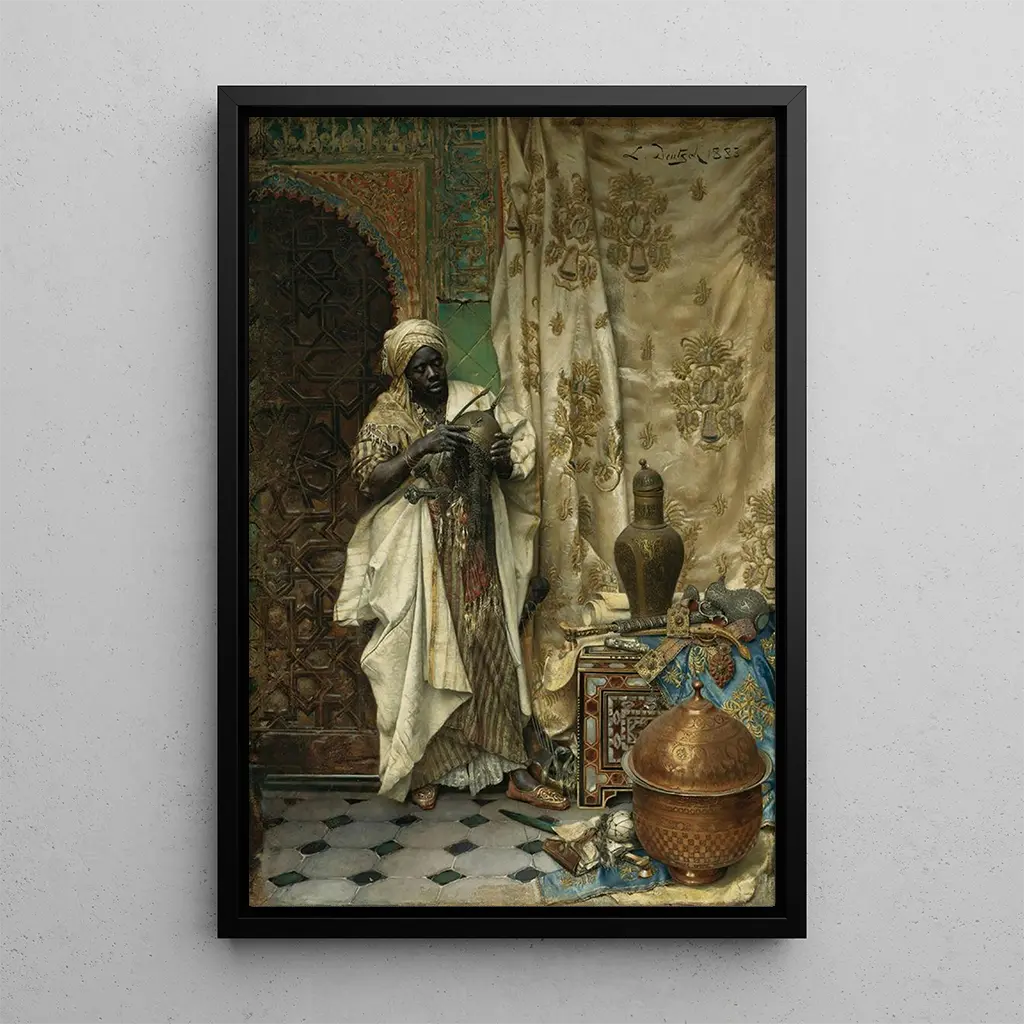 Das Kunstwerk "L'Inspection" von Ludwig Deutsch entführt uns in ein orientalisches Universum voller Details. Dieses Gemälde, mit seinen warmen Farben und goldenen Nuancen, vermittelt eine Atmosphäre von Geheimnis und Raffinesse. Die Komposition ist sorgfältig gestaltet und hebt Figuren in voller Interaktion hervor, umgeben von architektonischen Elementen, die typisch für den Orient sind. Die Technik von Deutsch, die Realismus und Romantik verbindet, ermöglicht es, nicht nur die Züge der Figuren, sondern auch die Essenz ihrer Umgebung einzufangen. Jeder Pinselstrich scheint eine Geschichte zu erzählen und lädt den Betrachter ein, in diese faszinierende Szene einzutauchen.