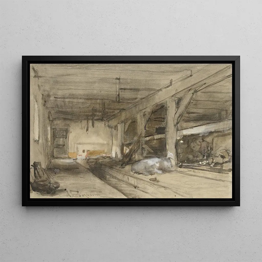 Innenansicht einer Scheune: eine ruhige und authentische Alltagsszene In dieser kunstdruck-Interpretation von Innenansicht einer Scheune taucht Johannes Bosboom ein in eine warme und intime Atmosphäre. Die erdigen Farbtöne und das Spiel mit Licht schaffen eine ruhige Stimmung, in der die Details der Pferde und der Reitausrüstung sorgfältig hervorgehoben werden. Die Ölmaltechnik, mit ihren zarten Pinselstrichen, ehrt die schlichte Schönheit des Landlebens. Jedes Element der Komposition, von sanften Schatten bis zu den Reflexionen der Gegenstände, trägt zu einem Gefühl der Ruhe bei und lädt den Betrachter ein, in diesen Moment der Stille einzutauchen. Johannes Bosboom: ein Meister des niederländischen Realismus Johannes Bosboom, aktiv im 19. Jahrhundert, ist bekannt für sein Talent, das tägliche Leben durch realistische Szenen einzufangen. Beeinflusst von der romantischen Bewegung, verstand er es, eine realistische Herangehensweise mit poetischer Sensibilität zu verbinden. Bosboom malte hauptsächlich Innenräume, Landschaften und Genreszenen, wobei er die Schönheit einfacher Momente hervorhob. Sein Werk wird oft mit der niederländischen Tradition in Verbindung gebracht, in der Natur und das Landleben eine zentrale Rolle spielen. Durch seine Gemälde hinterließ er ein nachhaltiges Erbe, das die Harmonie zwischen Mensch und Umwelt feiert. Eine dekorative Anschaffung mit vielfältigen Vorzügen Dieser kunstdruck von Innenansicht einer Scheune ist ein ideales Dekorationsstück für verschiedene Räume, sei es im Wohnzimmer, im Büro oder im Schlafzimmer. Seine Druckqualität und die Treue zum Originalwerk machen ihn zu einer attraktiven Wahl für Kunstliebhaber. Das Bild bringt Wärme und Authentizität in Ihre Inneneinrichtung und weckt gleichzeitig Neugier und Bewunderung. Mit seiner beruhigenden Ästhetik wird diese Leinwand Ihren Wohnraum bereichern und eine einladende sowie inspirierende Atmosphäre schaffen.