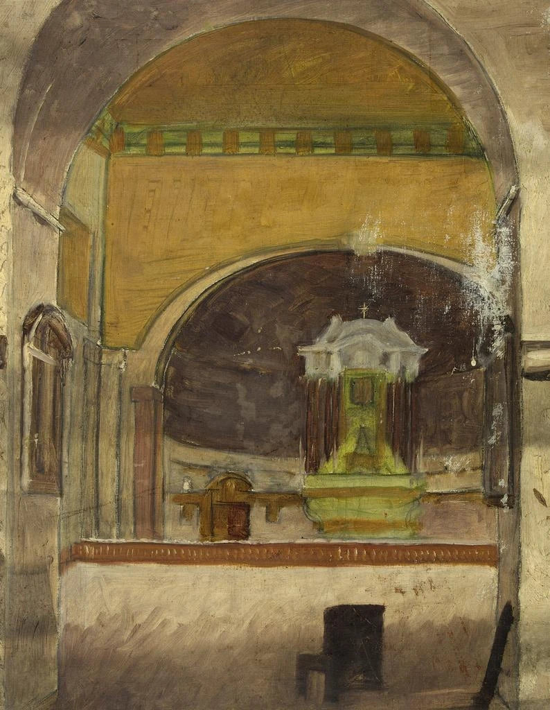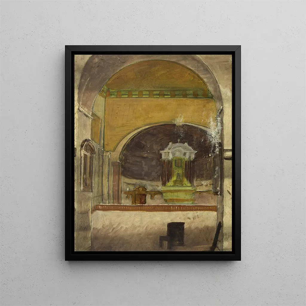 Das Werk von Arthur Joseph Gueniot zeichnet sich durch einen realistischen Ansatz und eine sorgfältige Detailarbeit aus. Jeder Pinselstrich scheint mit einer Absicht geladen zu sein, dem Wunsch, nicht nur das Aussehen der Kirche, sondern auch ihre Seele einzufangen. Die vom Künstler gewählten Farbnuancen, von warmen Tönen bis zu tieferen Schatten, schaffen eine Atmosphäre, die sowohl beruhigend als auch geheimnisvoll ist. Die Komposition ist sorgfältig orchestriert, jedes Element hat seinen Platz und trägt zum allgemeinen Gleichgewicht der Szene bei. Gueniot gelingt es, einen Dialog zwischen Architektur und Licht herzustellen, wodurch der Raum zu einer immersiven visuellen Erfahrung wird. Diese Fähigkeit, das Heilige und das Alltägliche in einer harmonischen visuellen Einheit zu verschmelzen, macht dieses Werk so einzigartig und zeitlos.