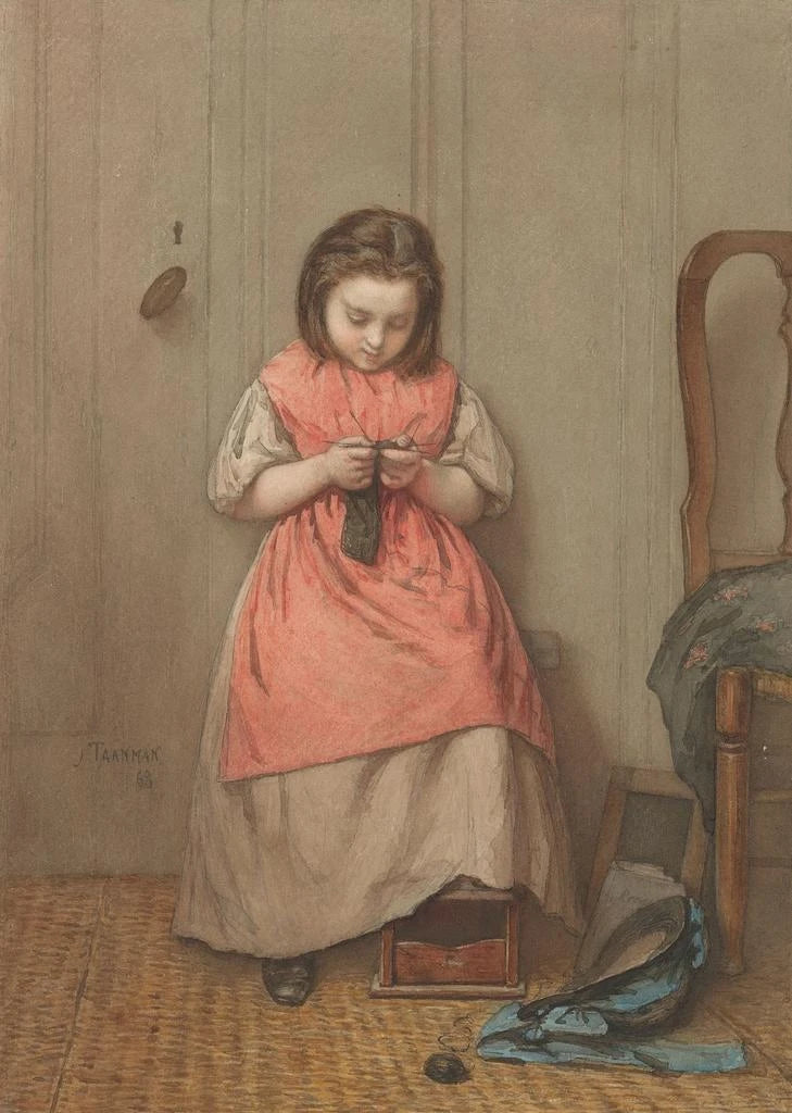 Innenraum-Gemälde mit einem Mädchen, das strickt - Jacob Taanman | Kunstdruck