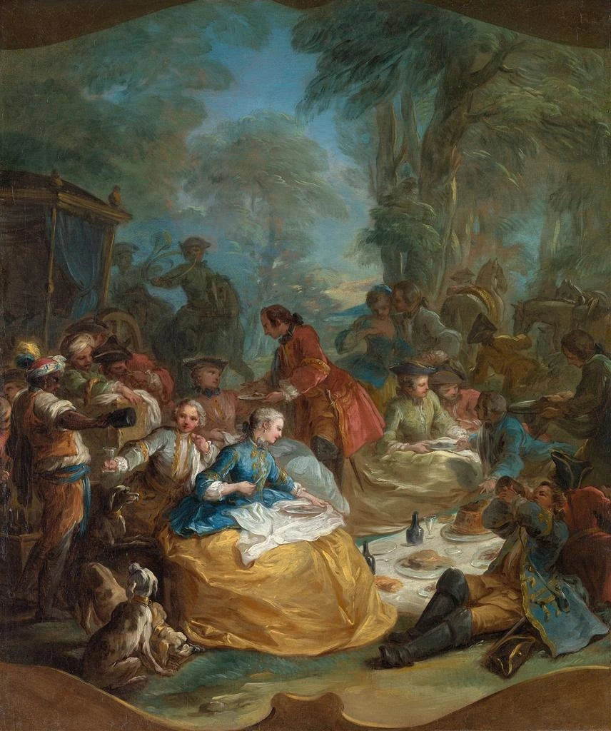 Reproduktion Jagdstopp - Charles André van Loo – Fesselnde Einführung Das Werk "Jagdstopp" von Charles André van Loo ist eine Einladung, in eine Welt einzutauchen, in der Natur und Kunst mit seltener Eleganz aufeinandertreffen. Dieses Gemälde, das die Noblesse der Jagdaktivitäten evoziert, besticht durch seine Fähigkeit, einen Moment von Anmut und Schönheit einzufangen. Die Szene zeigt Figuren in voller Interaktion mit ihrer Umgebung und offenbart nicht nur beeindruckendes technisches Können, sondern auch ein tiefes Verständnis für die menschliche und tierische Dynamik. Dieses Werk, ein Symbol des 18. Jahrhunderts, ist ein echtes Zeugnis der Rokoko-Ästhetik, in der Bewegung und Licht sich verflechten, um eine lebendige Atmosphäre zu schaffen. Stil und Einzigartigkeit des Werks Der Stil von Charles André van Loo zeichnet sich durch eine Feinheit in den Details und eine Palette warmer, leuchtender Farben aus. In "Jagdstopp" werden die Figuren mit einer Zartheit dargestellt, die ihre Eleganz unterstreicht, während die umliegenden Landschaften mit einer Fülle an Texturen und Nuancen wiedergegeben werden. Der Künstler nutzt das Licht, um Formen und Volumen zu betonen und so eine Tiefenillusion zu schaffen, die den Betrachter einlädt, in die Szene einzutauchen. Die Ausdrücke der Figuren, sei es die Konzentration der Jäger oder die Anmut der Tiere, zeugen von einer sorgfältigen Beobachtung der menschlichen Natur. Dieses Werk besticht durch seine Fähigkeit, eine Geschichte zu erzählen, Emotionen hervorzurufen und gleichzeitig eine idealisierte Vision des aristokratischen Lebens zu bieten. Der Künstler und sein Einfluss Charles André van Loo, geboren 1705, zählt zu den Meistern des französischen Rokoko. In der Werkstatt seines Vaters ausgebildet, entwickelte er einen Stil, der die klassische Tradition mit einer neuen Sensibilität verbindet. Sein Werk ist in einen künstlerischen Kontext eingebettet, in dem die Darstellung des Alltagslebens und der Vergnügungen am Hof immer wichtiger wird. Van Loo verstand es, die Eliten seiner Zeit zu begeistern, und seine Gemälde waren bei Adeligen sehr gefragt, was ihm ermöglichte, durch Europa zu reisen und zahlreiche zeitgenössische Künstler zu beeinflussen. Sein innovativer Ansatz ebnete den Weg für eine Neudefinition der Gattungen der Malerei, die Mythologie, Porträt und Landschaft miteinander verbindet. Durch seine thematischen und stilistischen Entscheidungen