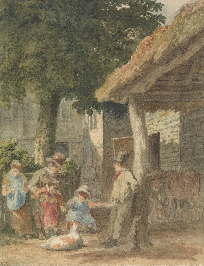 Kinder mit einem Hund im Hof des Bauernhofs - Robert Hills