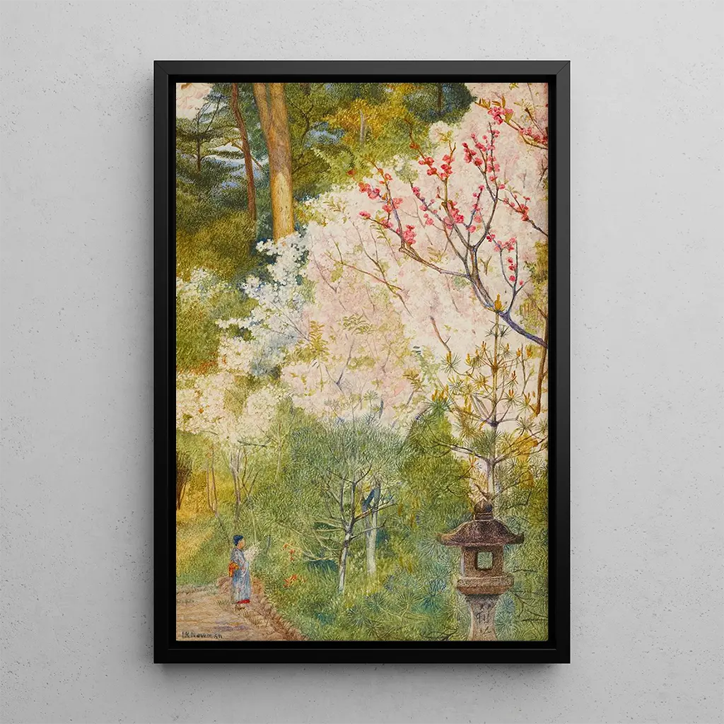 "Fleurs de cerisier à Kyoto" de Henry Roderick Newman fängt die Magie der blühenden Kirschbäume ein, Symbol für die vergängliche Schönheit der Natur. Die Pastelltöne, die von zartem Rosa bis zu reinem Weiß reichen, verschmelzen harmonisch, um eine ruhige und träumerische Atmosphäre zu schaffen. Die Technik von Newman, die leichte und fließende Pinselstriche bevorzugt, erweckt jedes Blütenblatt zum Leben und evoziert die Sanftheit eines japanischen Frühlings. Dieses Gemälde lädt zur Kontemplation ein und erinnert uns daran, dass Schönheit oft im Vergänglichen liegt.