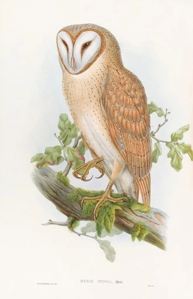Der Petit-duc indien, mit seinen zarten Federn und seinen scharfen Augen, zeigt sich in einer harmonischen Komposition, die die Aufmerksamkeit auf sich zieht. Die Nuancen von Braun und Creme verschmelzen subtil und erinnern an die Sanftheit indischer Landschaften. Die von John Gould verwendete Gravurtechnik ermöglicht es, jedes Detail mit bemerkenswerter Präzision wiederzugeben und schafft eine Atmosphäre, die sowohl ruhig als auch faszinierend ist. Dieses Werk lädt zu einer aufmerksamen Betrachtung ein und offenbart die Majestät dieses nachtaktiven Vogels, der oft unbekannt ist.