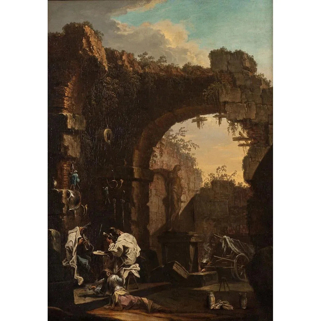 Alessandro Magnasco, Maler des 18. Jahrhunderts, ist bekannt für seine barocken Werke, die Realismus und Fantasie verbinden. Beeinflusst von der Rococo-Bewegung, hat er einen einzigartigen Stil entwickelt, der sich durch dynamische Kompositionen und lebendige Farben auszeichnet. Magnasco hat häufig Themen wie Musik und Festlichkeiten erforscht, dabei aber auch Elemente des Verfalls und der Nostalgie integriert. „Konzert in den Ruinen“ veranschaulicht perfekt sein Talent, lebendige Momente des Lebens einzufangen und gleichzeitig eine Reflexion über die Zerbrechlichkeit der Existenz zu vermitteln.