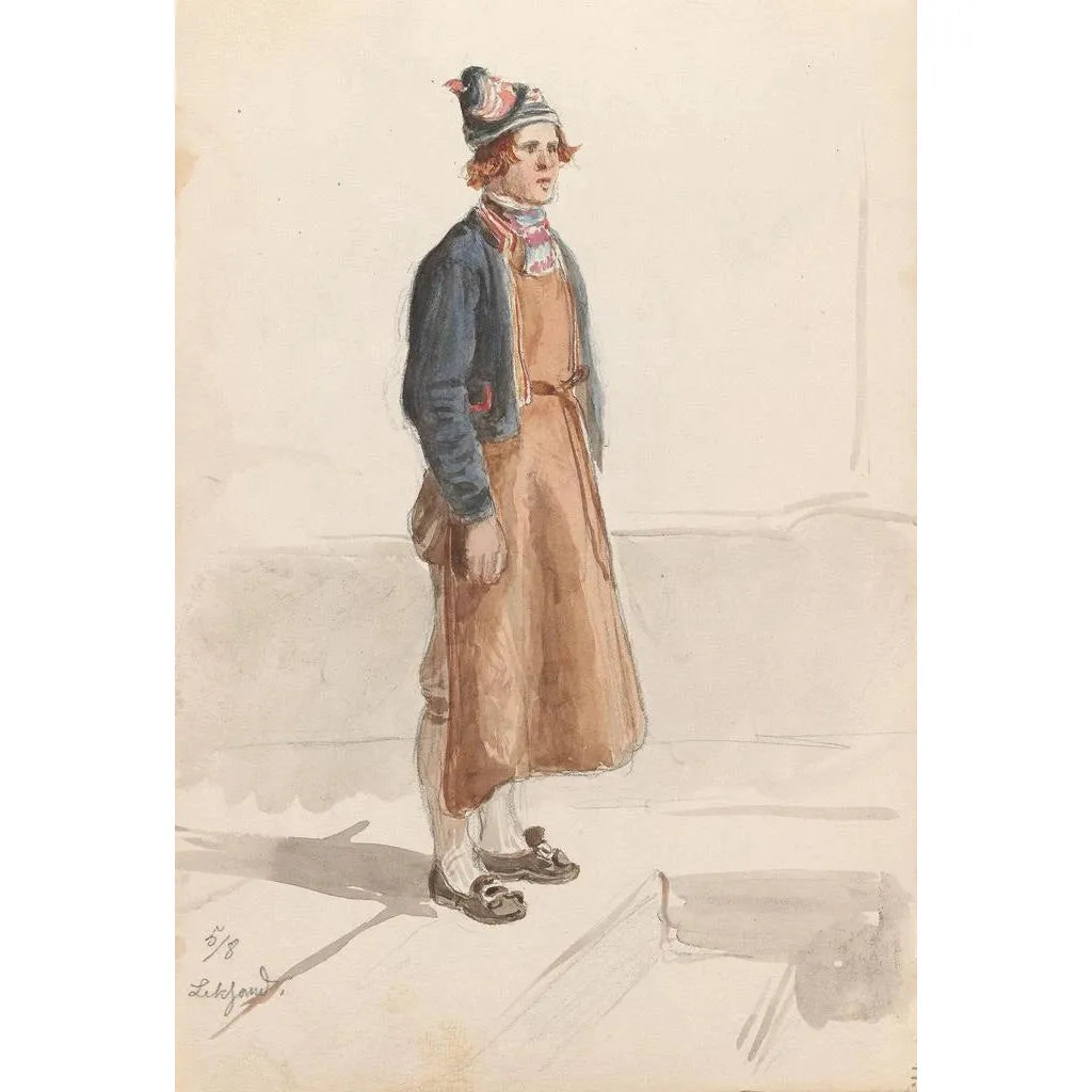 Adolph Tidemand, norwegischer Maler des 19. Jahrhunderts, ist bekannt für seine Rolle in der skandinavischen Romantikbewegung. Beeinflusst von den majestätischen Landschaften seines Heimatlandes und den folkloristischen Traditionen, konnte Tidemand die Seele Norwegens durch seine Werke einfangen. Seine Karriere, geprägt von Reisen durch Europa, ermöglichte es ihm, seinen Stil zu verfeinern und Elemente der Historienmalerei zu integrieren. Die Bedeutung von Tidemand liegt in seiner Fähigkeit, Bräuche und Szenen des Alltagslebens zu verewigen, wodurch er zu einem privilegierten Zeugen seiner Zeit wird. Seine Gemälde, wie "Studienkostüm Leksand", sind offene Fenster in eine reiche und lebendige Vergangenheit.
