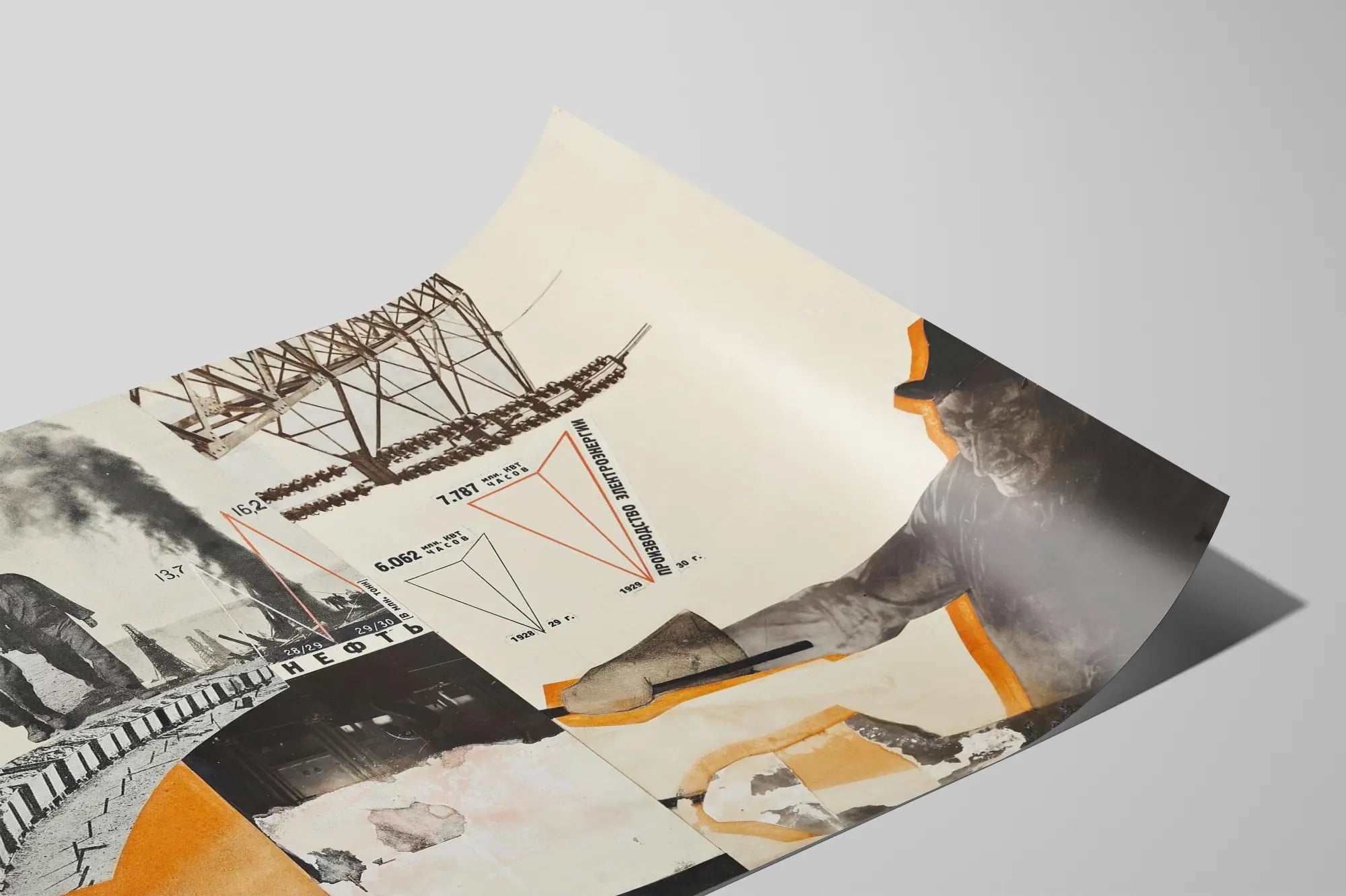 Entdecken Sie ein einzigartiges Poster, das industrielle Bilder und grafische Elemente kunstvoll verbindet – perfekt für eine mutige und originelle Wanddekoration. Diese Wandgestaltung zeigt eine feine Zusammenstellung schwarz-weißer Fotografien, kombiniert mit leuchtend orangefarbenen Flächen, die einen starken, dynamischen Kontrast erzeugen und sofort ins Auge fallen. Das Poster enthält Darstellungen von Arbeitern, Industrieanlagen und Datenvisualisierungen, die eine retro- und industriell anmutende Atmosphäre in Wohn- oder Arbeitsräumen schaffen. Mit seinen grafischen Linien und warmen Farbtönen passt dieses Wandbild in einen Vintage-Trend, der die industrielle und technische Geschichte widerspiegelt. Dieses Poster ist besonders geeignet für Liebhaber grafischen Designs sowie für jene, die ihrer Inneneinrichtung eine Note von Authentizität und Charakter verleihen möchten. Ob im Wohnzimmer, Büro oder Schlafzimmer platziert, kann dieses Modell auch als inspirierender Blickfang dienen. Jedes Detail, von menschlichen Figuren bis zu technischen Elementen, trägt zu einer kraftvollen und ausdrucksstarken Wanddekoration bei. Sein moderner Collage-Stil macht dieses Poster zur idealen Wahl für zeitgenössische, industrielle und minimalistische Räume, die eine markante und charaktervolle Wandgestaltung suchen.