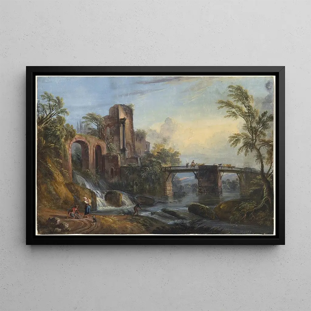 Die kunstdruck von Landschaft bei Sonnenaufgang mit klassischen Ruinen von Jean-Baptiste Lallemand entführt uns in eine Welt, in der natürliche Schönheit auf Überreste der Vergangenheit trifft. Dieses Werk zeigt eine ruhige Landschaft, getaucht in zarte Pastelltöne, in der das sanfte Licht des Sonnenaufgangs die antiken Ruinen erleuchtet. Die detaillierten architektonischen Elemente, verbunden mit der umgebenden Grünfläche, schaffen eine Atmosphäre von Ruhe und Kontemplation. Lallemand gelingt es, die Magie eines flüchtigen Moments einzufangen und den Betrachter einzuladen, in diese poetische Szene einzutauchen.