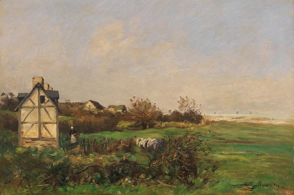 Landschaft mit Fachwerkhaus und Bäuerin - Antoine Guillemet