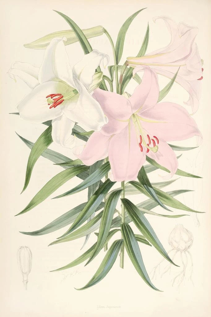Lilium Japonicum : eine zarte florale Harmonie Lilium Japonicum, ein ikonisches Werk von Walter Hood Fitch, zeichnet sich durch seine sorgfältige und poetische Darstellung dieser majestätischen Blume aus. Die lebendigen und strahlenden Farben, die von reinem Weiß bis zu goldenem Gelb reichen, erinnern an das sanfte Licht eines Frühlingsmorgens. Die Technik von Fitch, die Aquarell und Zeichnung kombiniert, ermöglicht es, die zarten Details der Blütenblätter und Blätter einzufangen und eine fast traumhafte Atmosphäre zu schaffen. Jeder Pinselstrich scheint diesem Pflanzenleben eine neue Lebenskraft einzuhauchen und lädt den Betrachter ein, in eine Welt natürlicher Schönheit einzutauchen. Walter Hood Fitch : der Meister der botanischen Illustrationen Walter Hood Fitch, geboren 1817, gilt als einer der bedeutendsten botanischen Illustratoren des 19. Jahrhunderts. Seine Karriere, geprägt von einer Leidenschaft für die Natur, führte ihn zu Arbeiten für renommierte Institutionen wie die Royal Botanic Gardens in Kew. Beeinflusst von der romantischen Bewegung, konnte Fitch wissenschaftliche Präzision mit künstlerischer Sensibilität verbinden und würdigt die florale Vielfalt der Welt. Seine Werke, darunter Lilium Japonicum, zeugen von seinem Engagement, die botanische Kunst zur eigenständigen Kunstform zu erheben und gleichzeitig zum wissenschaftlichen Verständnis seiner Zeit beizutragen. Eine dekorative Anschaffung mit vielfältigen Vorzügen Der kunstdruck von Lilium Japonicum ist eine ideale dekorative Wahl, um Ihr Interieur zu verschönern, sei es im Wohnzimmer, im Büro oder im Schlafzimmer. Seine hochwertige, detailgetreue Druckqualität und seine ästhetische Anziehungskraft machen ihn zu einem faszinierenden Bild, das das Auge anzieht und Bewunderung hervorruft. Durch die Integration dieses Leinwandbildes in Ihre Dekoration bringen Sie einen Hauch von Natur und Ruhe in Ihren Raum und feiern gleichzeitig das Talent eines Künstlers, der die vergängliche Schönheit der Blumen verewigt hat. Dieses Werk ist nicht nur eine dekorative Ergänzung, sondern auch eine tägliche Inspirationsquelle.