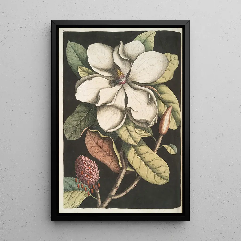 Die kunstdruck von Magnolia altissima, auch bekannt als der Laurier von Caroline, vermittelt eine Atmosphäre von Gelassenheit und natürlicher Schönheit. Die sanften Farben und die detaillierten Feinheiten dieses Werks fangen die Majestät der Pflanze ein, mit leuchtenden Grüntönen und Tupfern reinen Weißes. Die Aquarelltechnik, die von Mark Catesby verwendet wird, ermöglicht es, die Zartheit der Blütenblätter und die Fülle des Laubs darzustellen. Dieses Gemälde lädt zu einer friedlichen Betrachtung ein, bei der jedes Element zu vibrieren scheint und den Betrachter in einen üppigen Garten entführt.