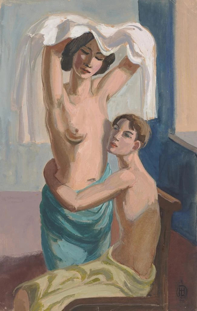 Kunstdruck | Mann sitzend, umarmt eine nackte Frau stehend - Hermann Lismann